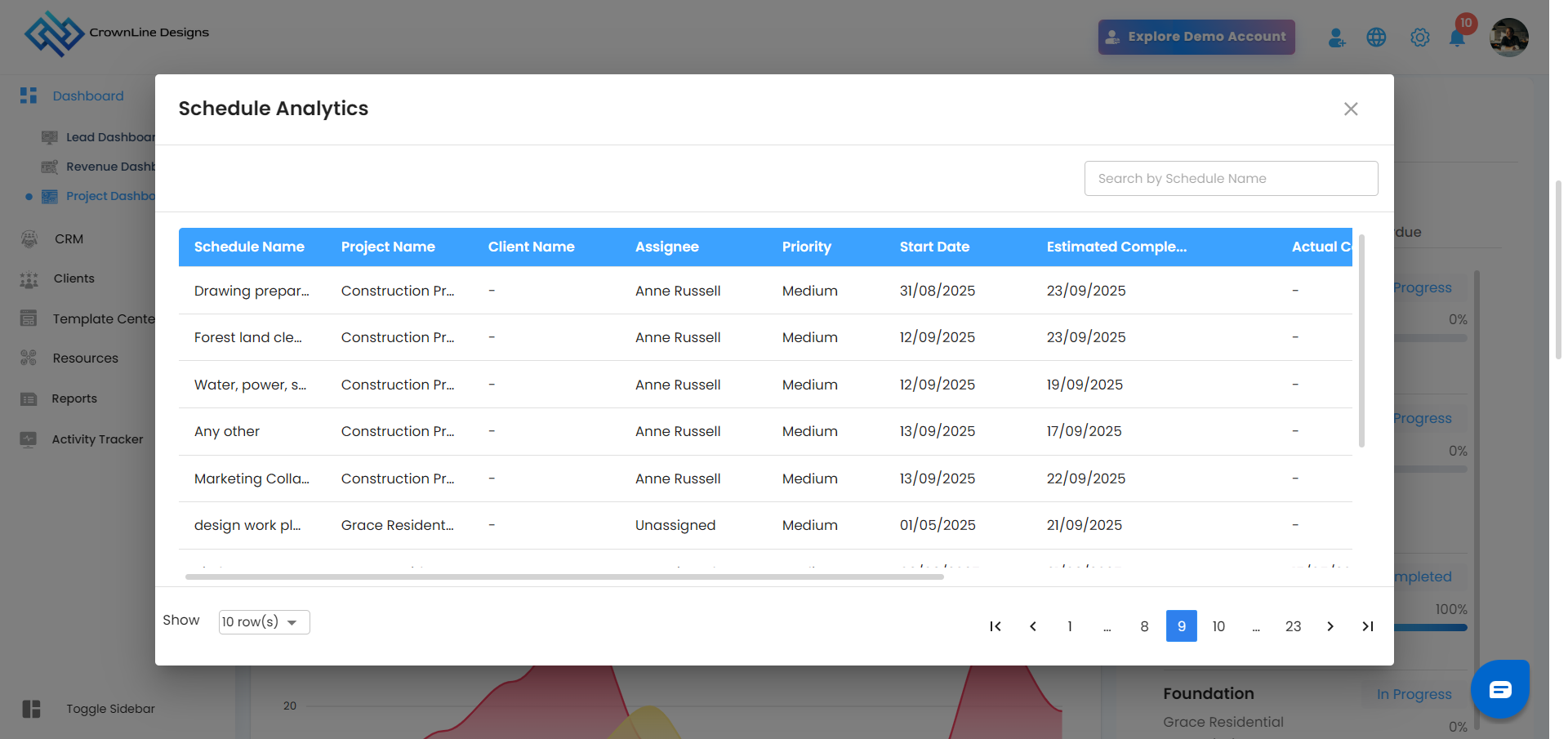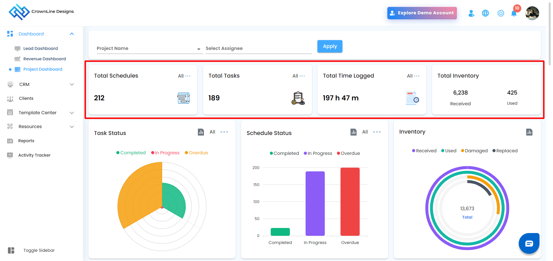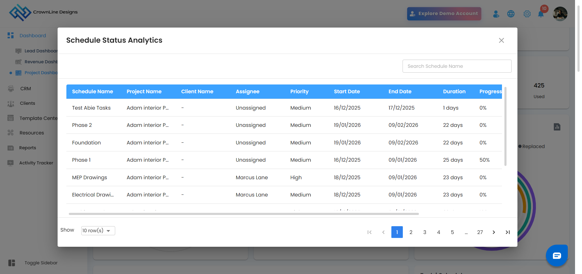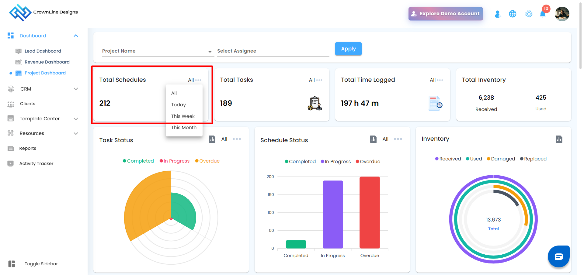 The summary cards on the Project Dashboard are now interactive, allowing quick navigation to detailed reports.Clicking Total Schedules redirects to: