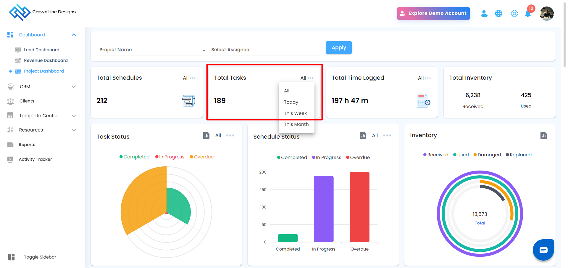 The Total Tasks card shows the overall number of tasks created across all projects. You can apply filters to view task counts based on the creation date: