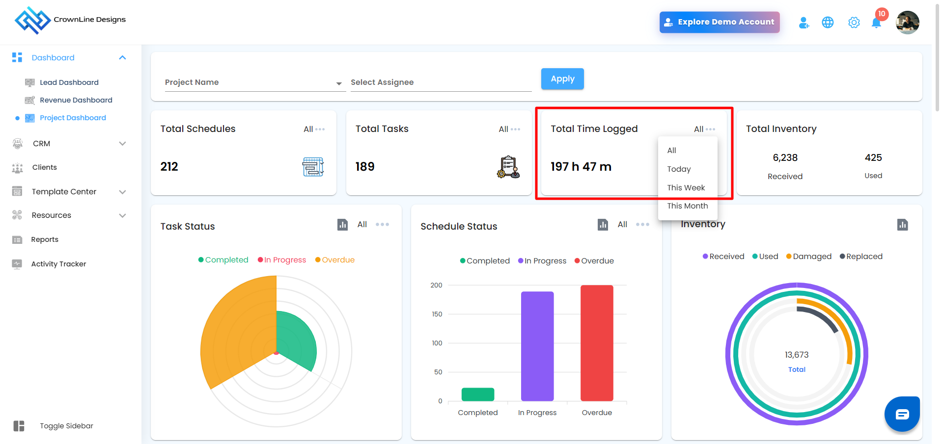The Total Time Logged card displays the total amount of time worked by all users across projects. You can use the filters to view logged time for different periods: