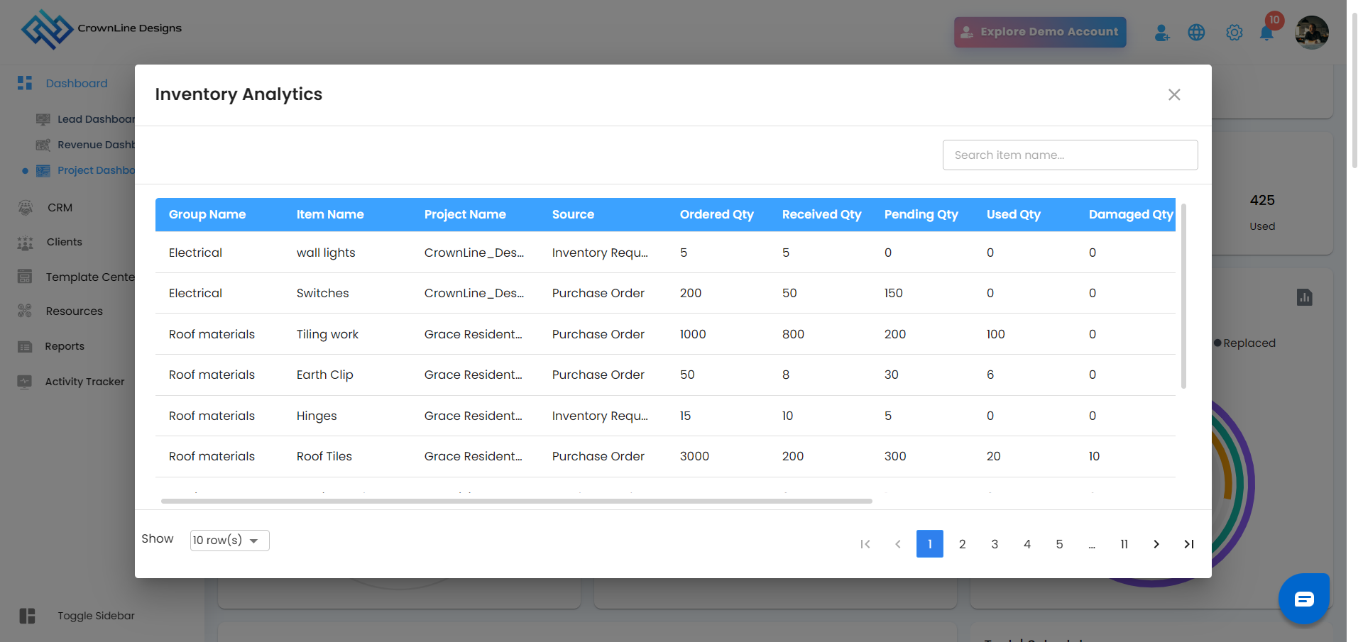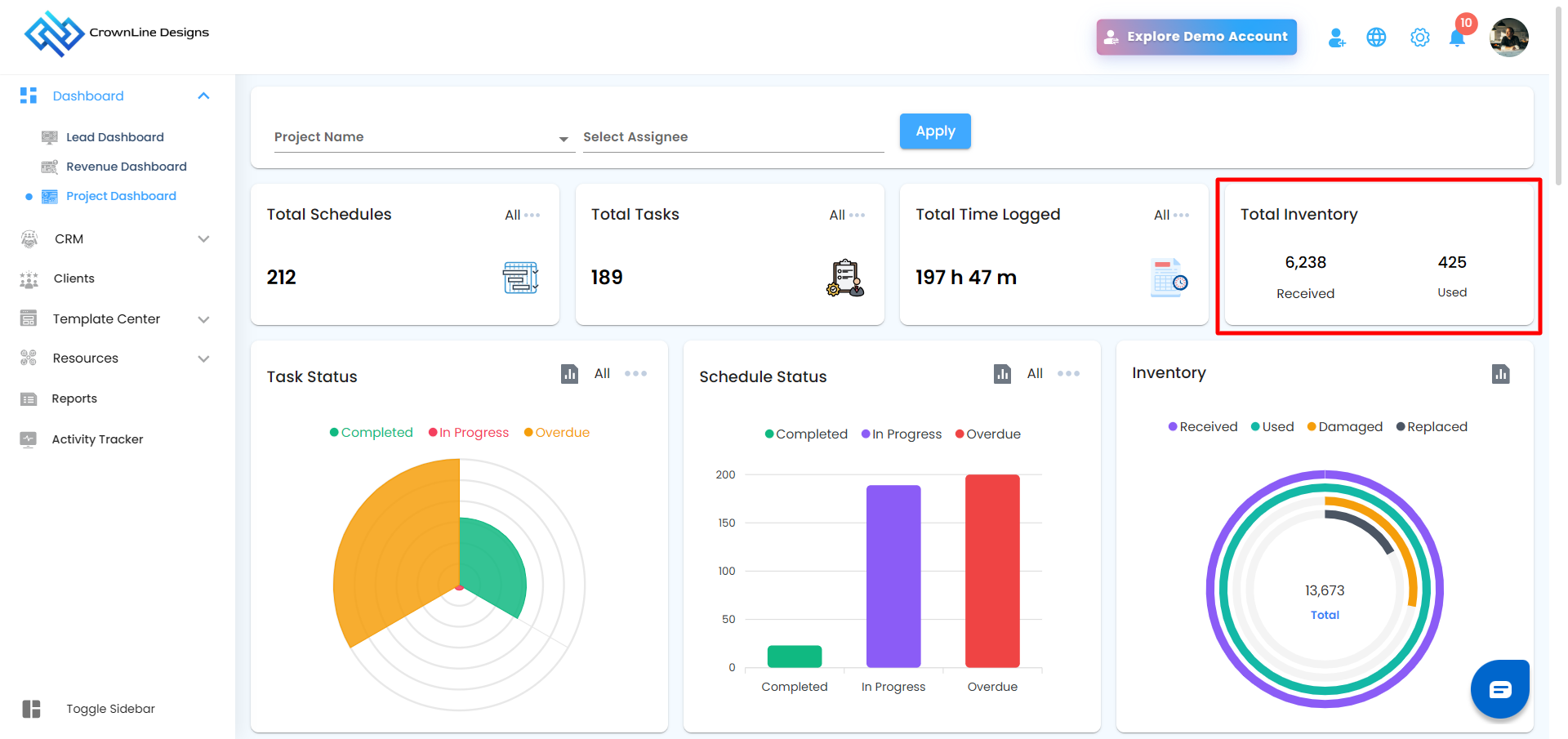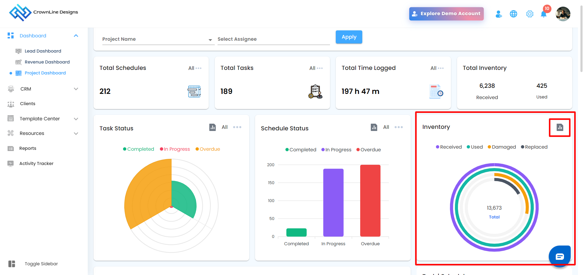 The Inventory Pie Chart Card gives a visual breakdown of inventory movement across all projects. It helps you track the overall status of inventory items.