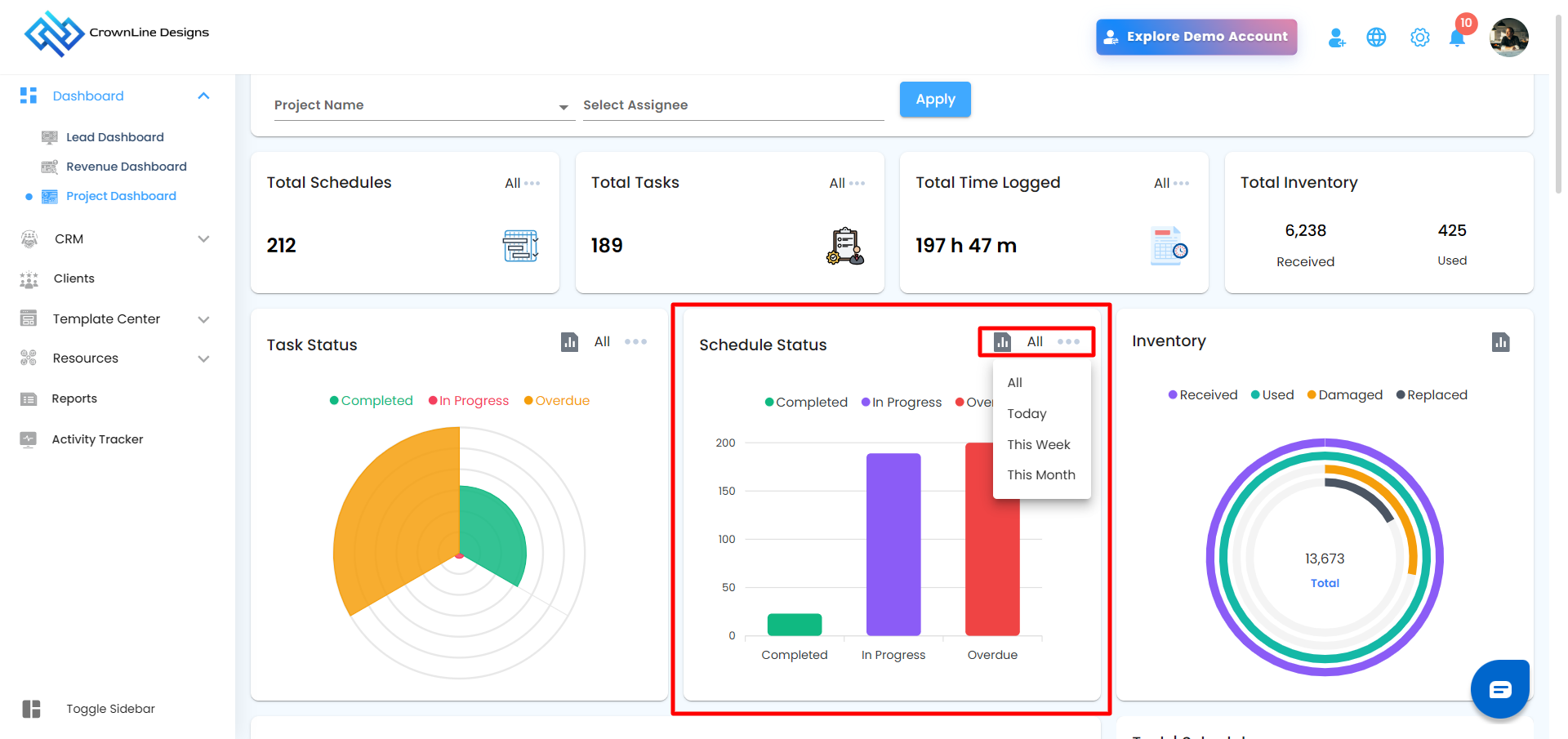 The Schedule Status Bar Graph displays a visual overview of all schedules based on their current status. It helps you track how schedules are progressing across all projects.