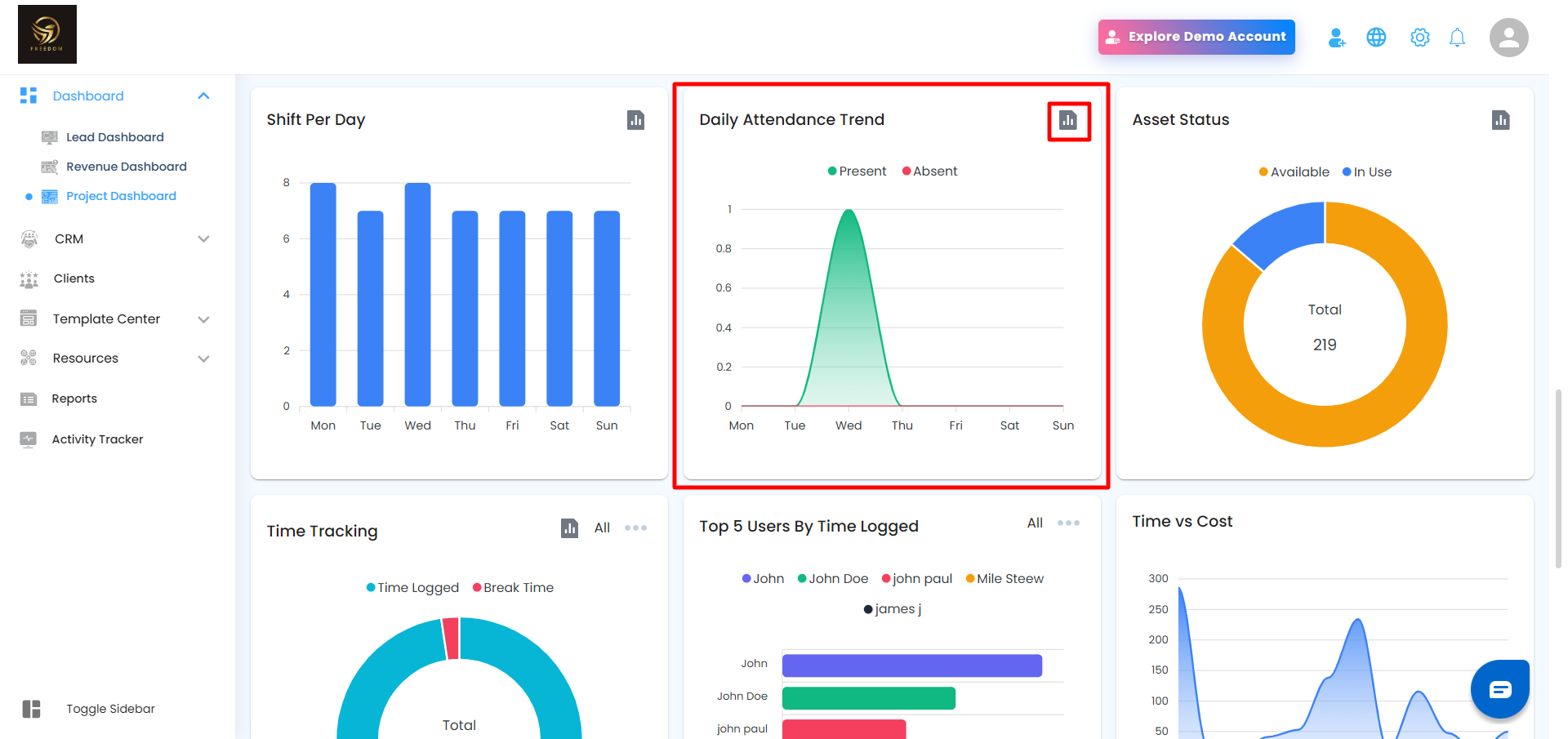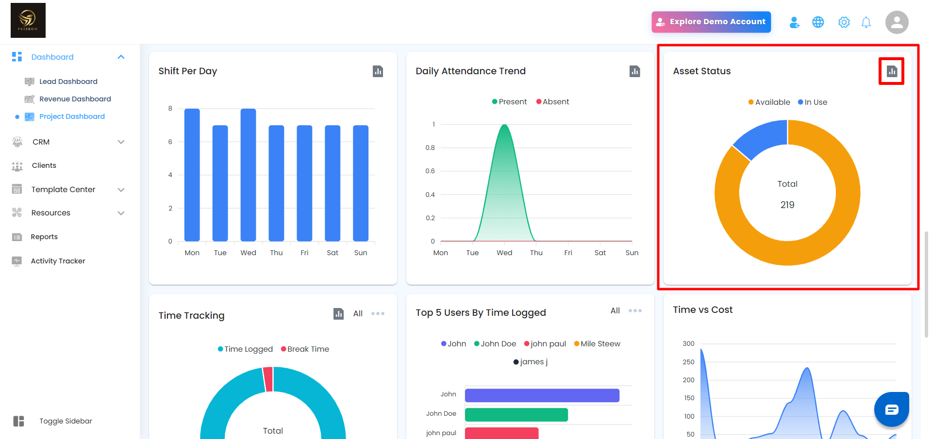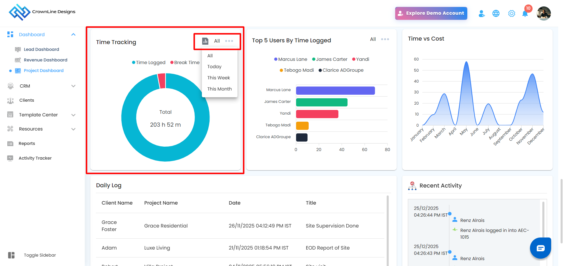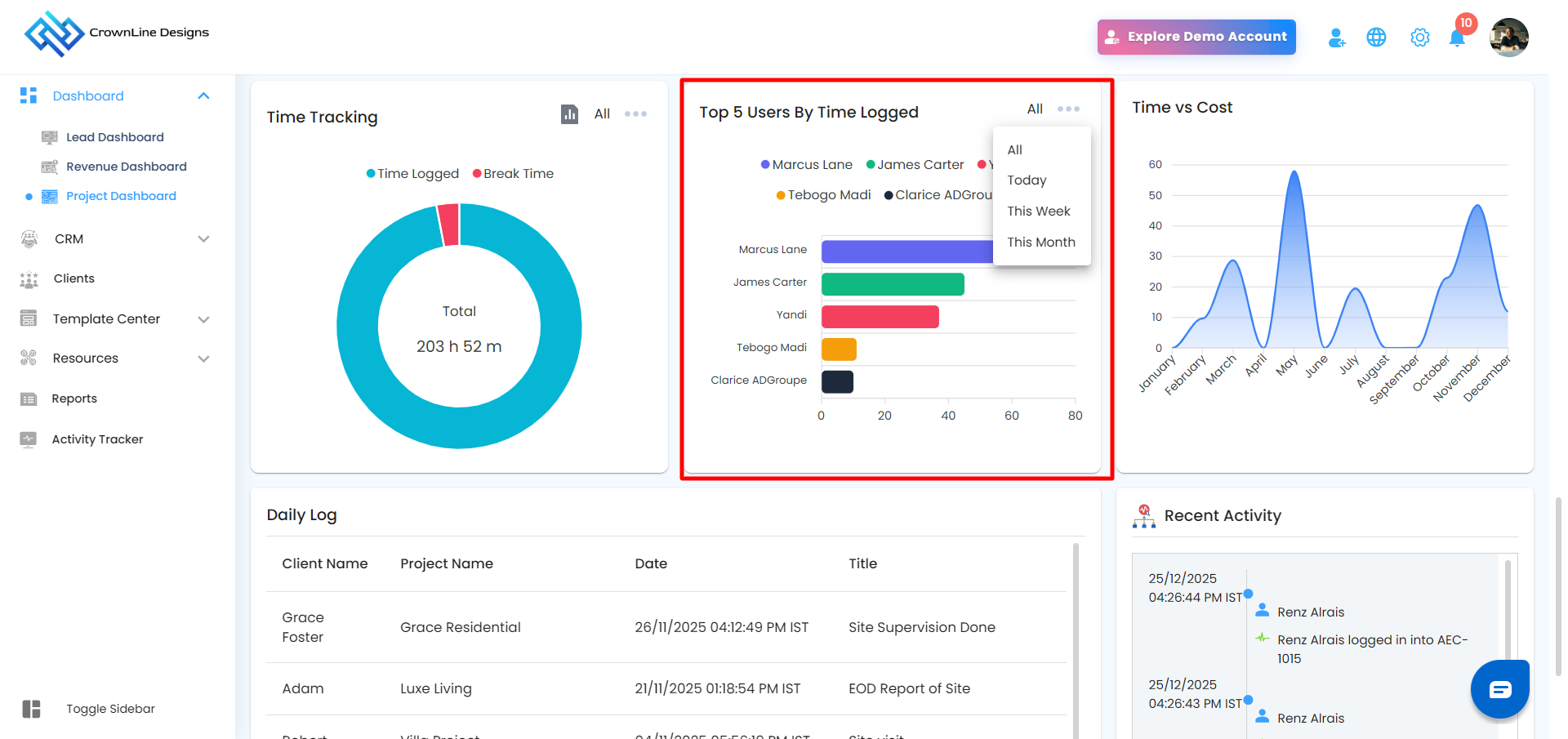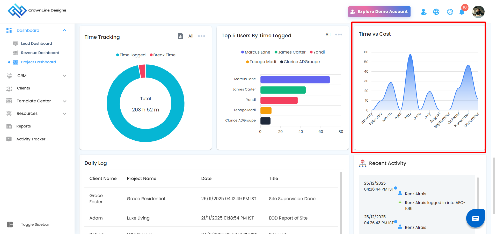 The Time vs Cost Graph card provides a visual comparison of how much time has been worked and the corresponding cost, calculated across all projects.