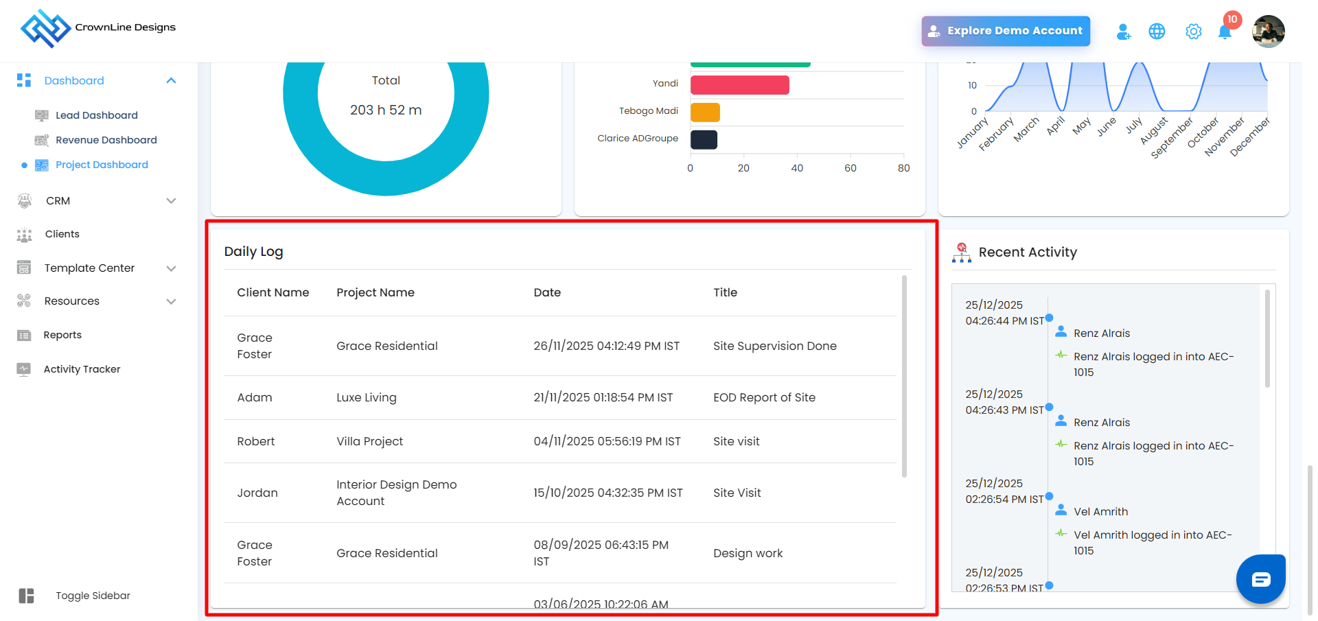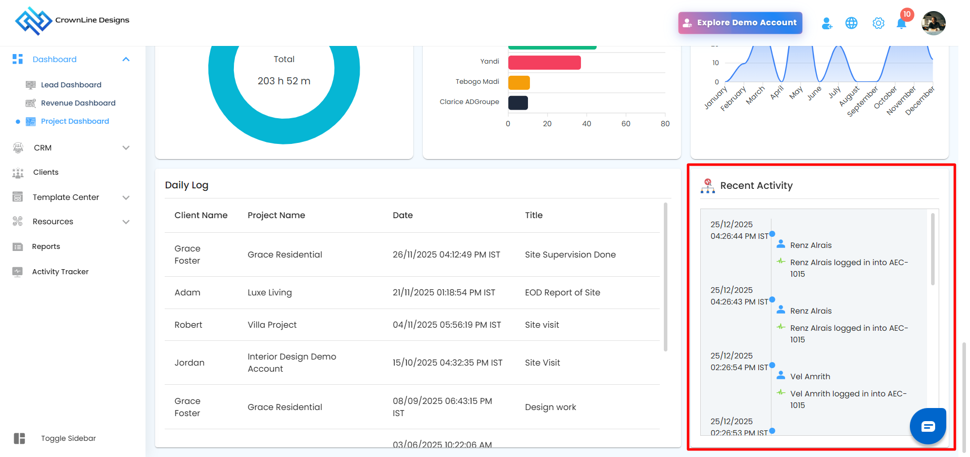 The Recent Activity Card displays the latest activities carried out within the organization across all projects. Each entry shows the date, time, and time zone of the activity, along with a brief description of the action performed. This card helps you stay informed about recent updates and track ongoing progress in real time.