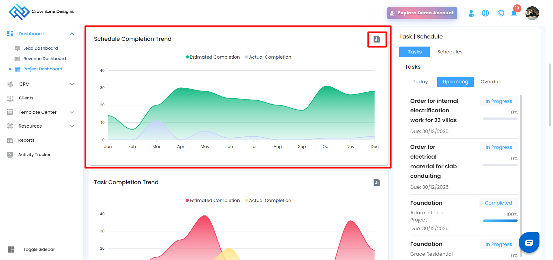 The Schedule Completion Trend Card displays a graph comparing the estimated completion and actual completion of all schedules across projects.