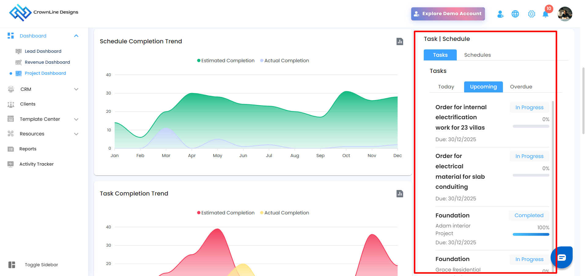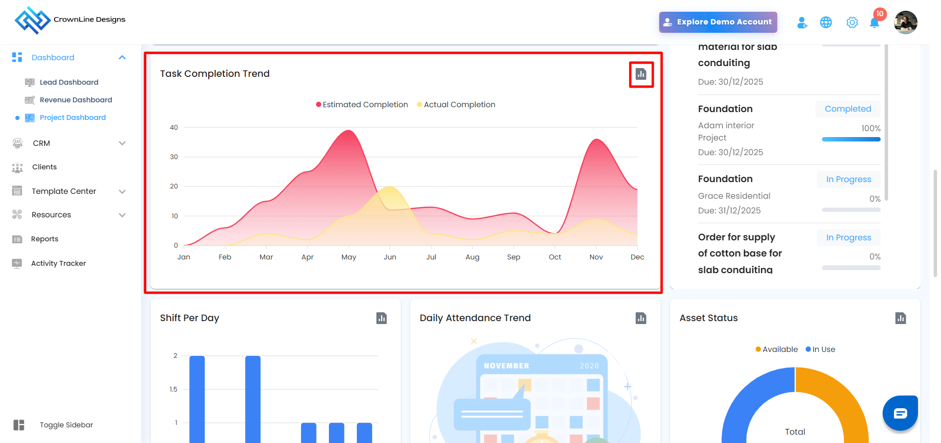 The Task Completion Trend Card displays a graph comparing the estimated completion and actual completion of all tasks across projects.