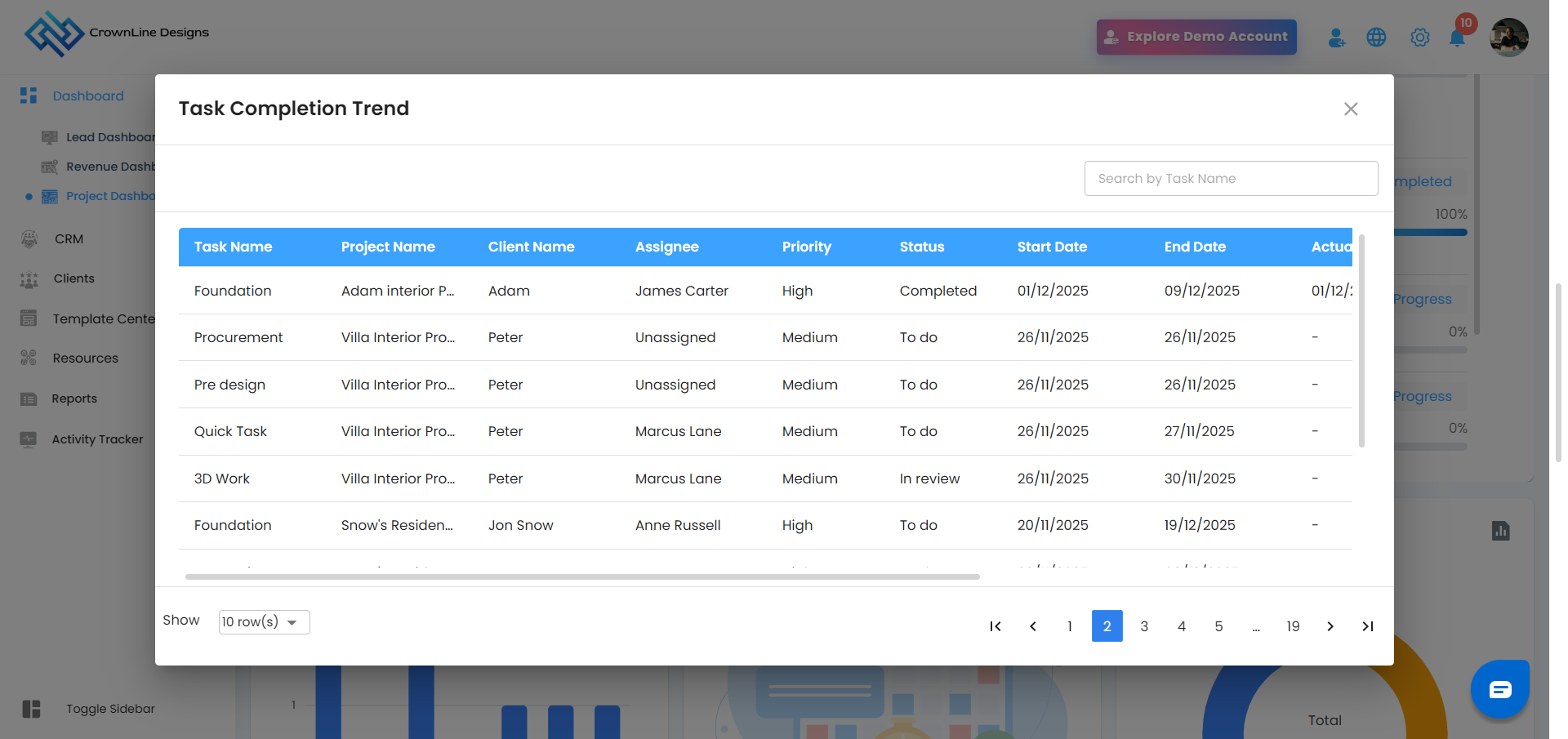 Analytics ViewClick Analytics icon to open Task Completion Analytics popup