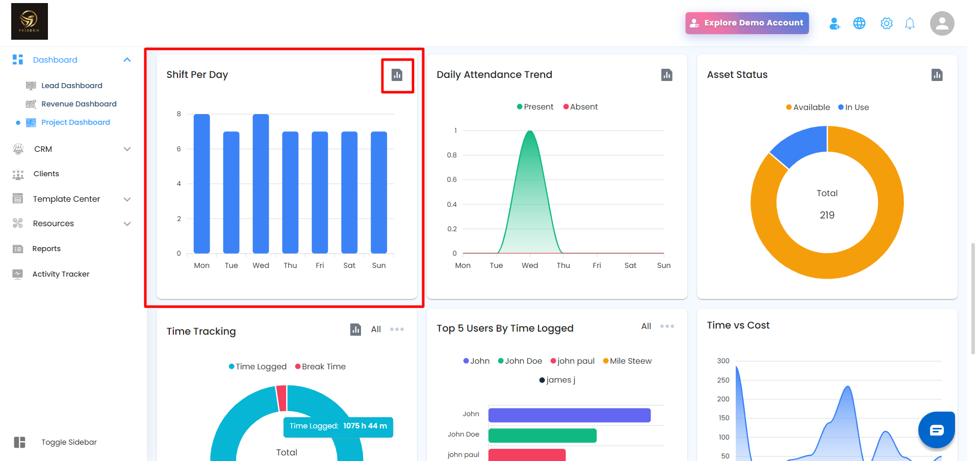 The Shift Per Day card displays a bar chart showing the number of shifts per day for the current week.