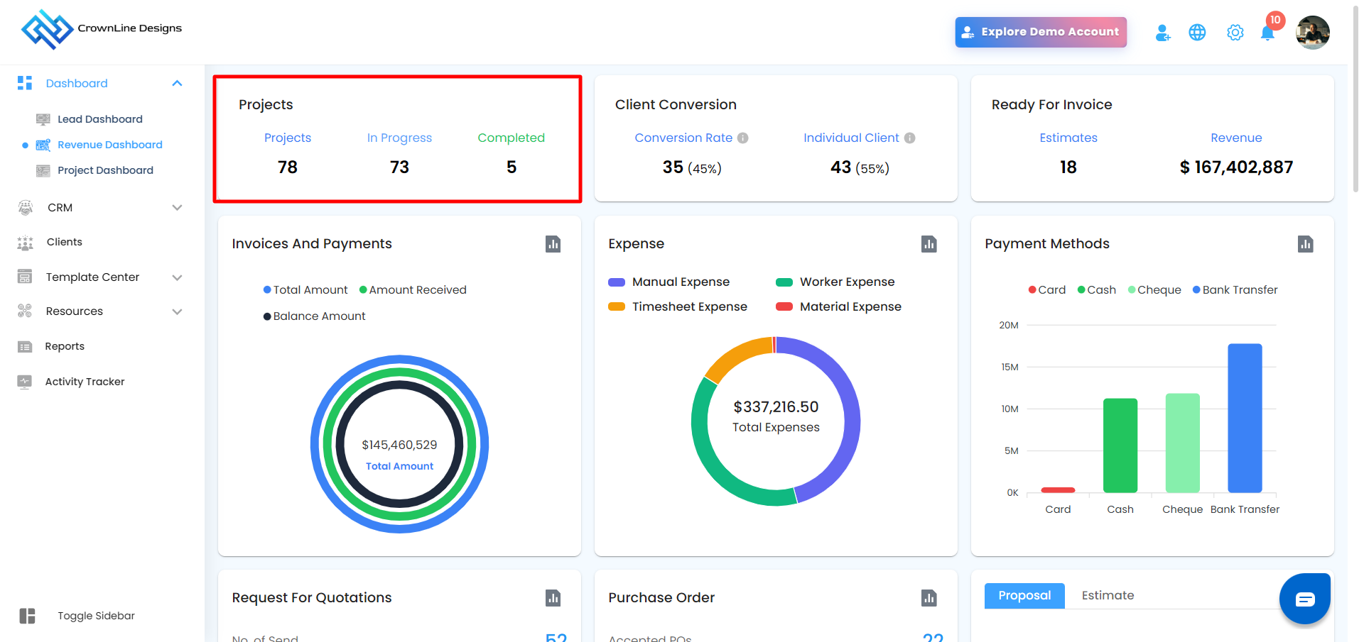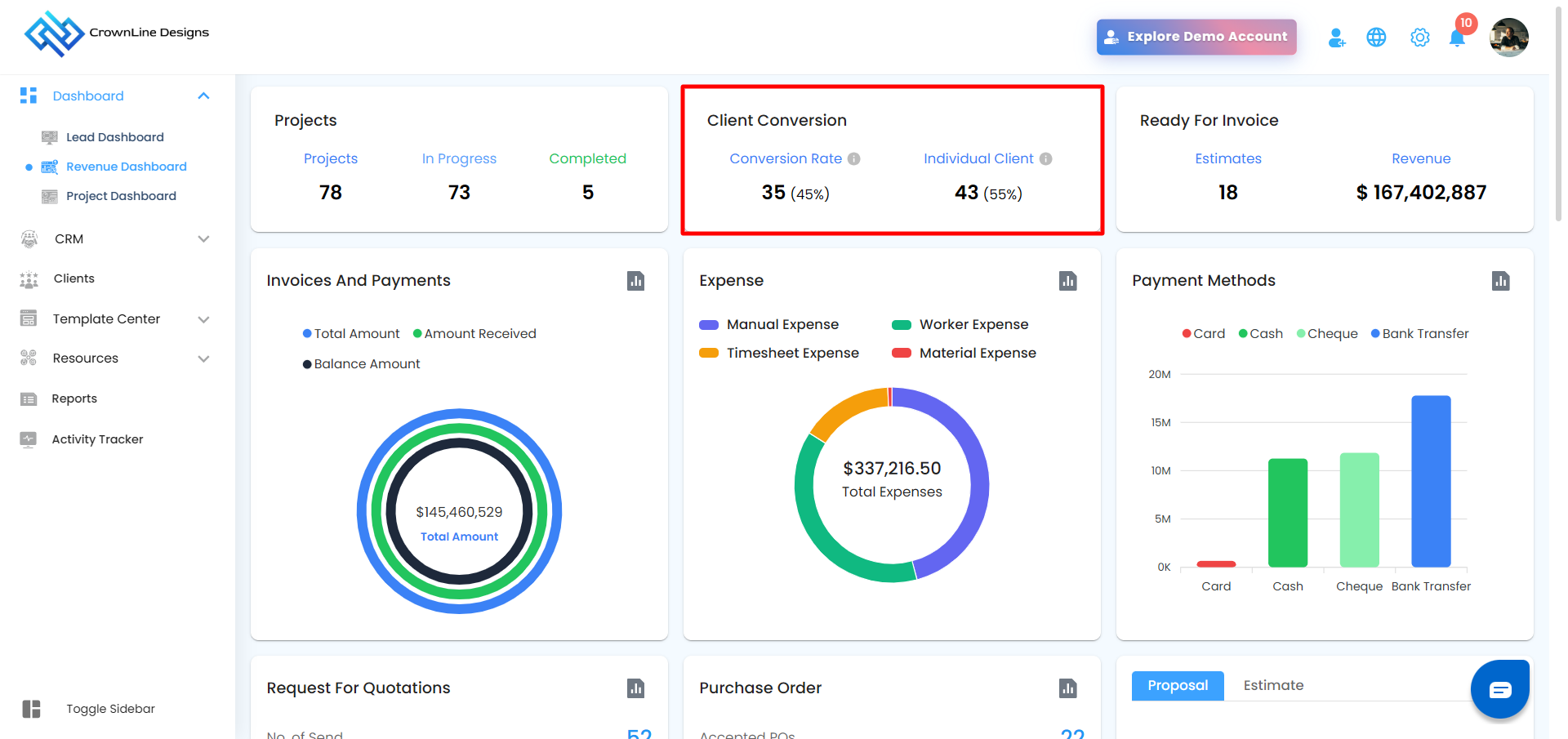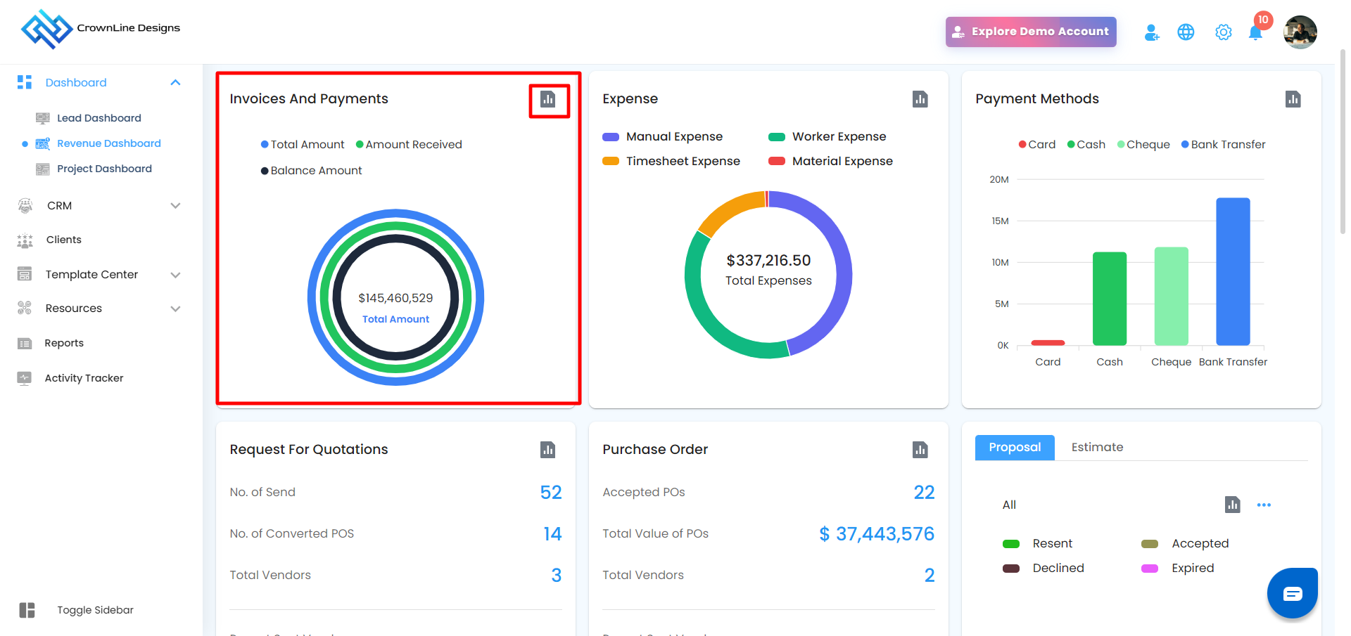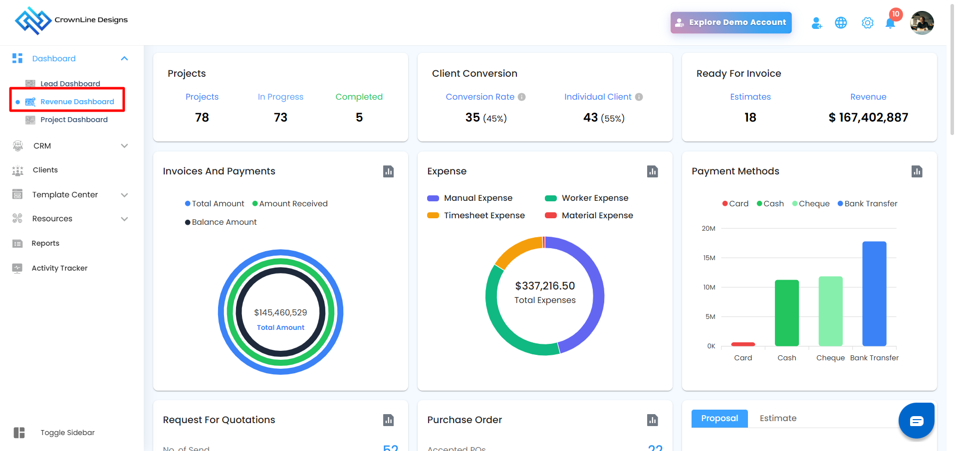 The Revenue Dashboard in the IntoAEC application is your financial control tower. From one place, you can monitor revenue performance, project statuses, client conversions, invoices, expenses, and profits — all tied together with interactive visuals and smart insights.