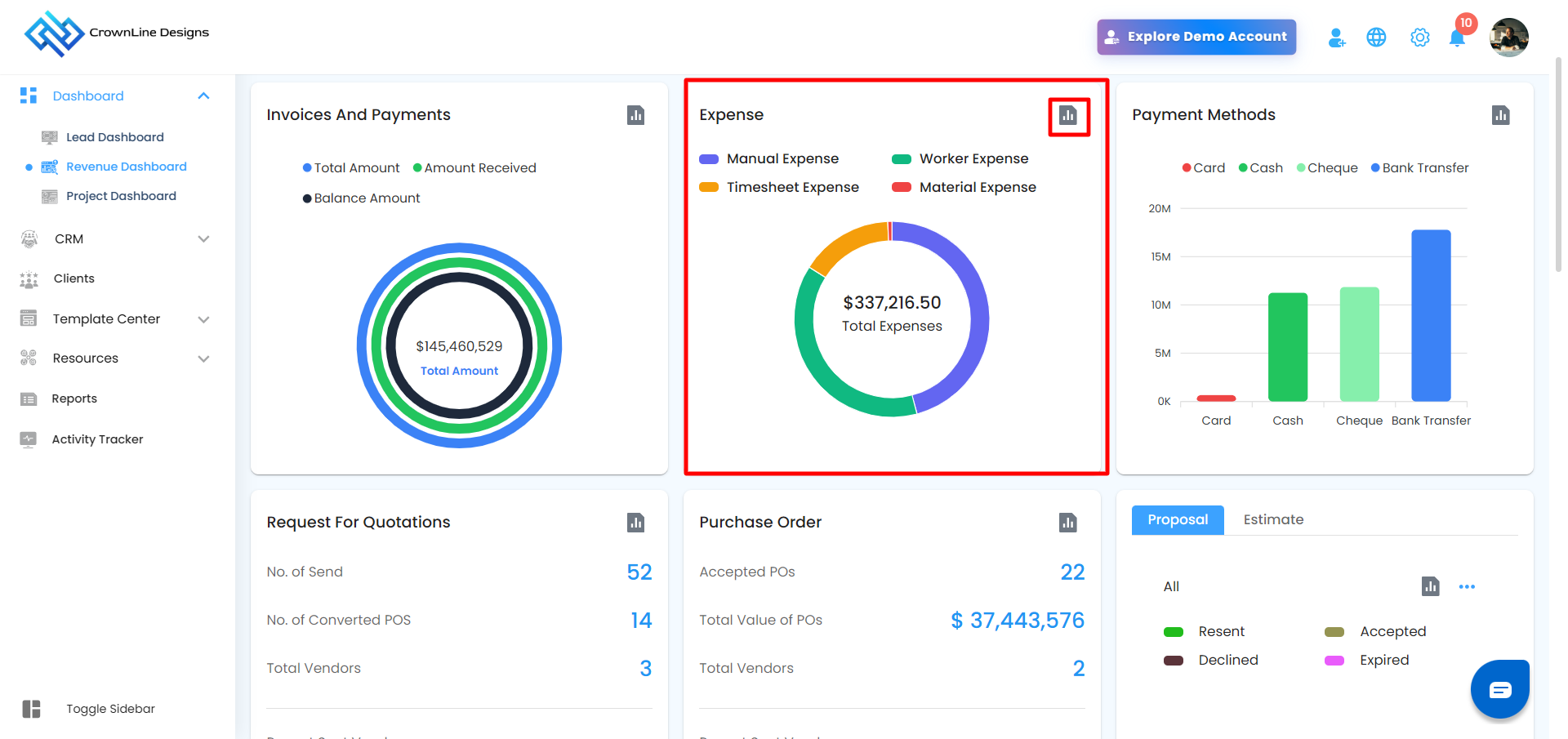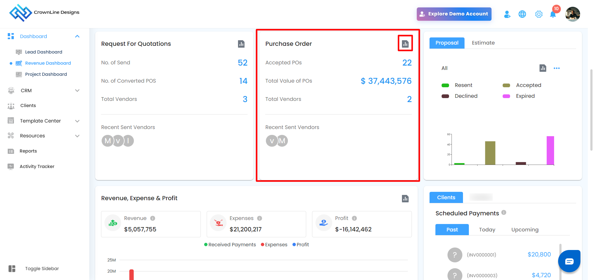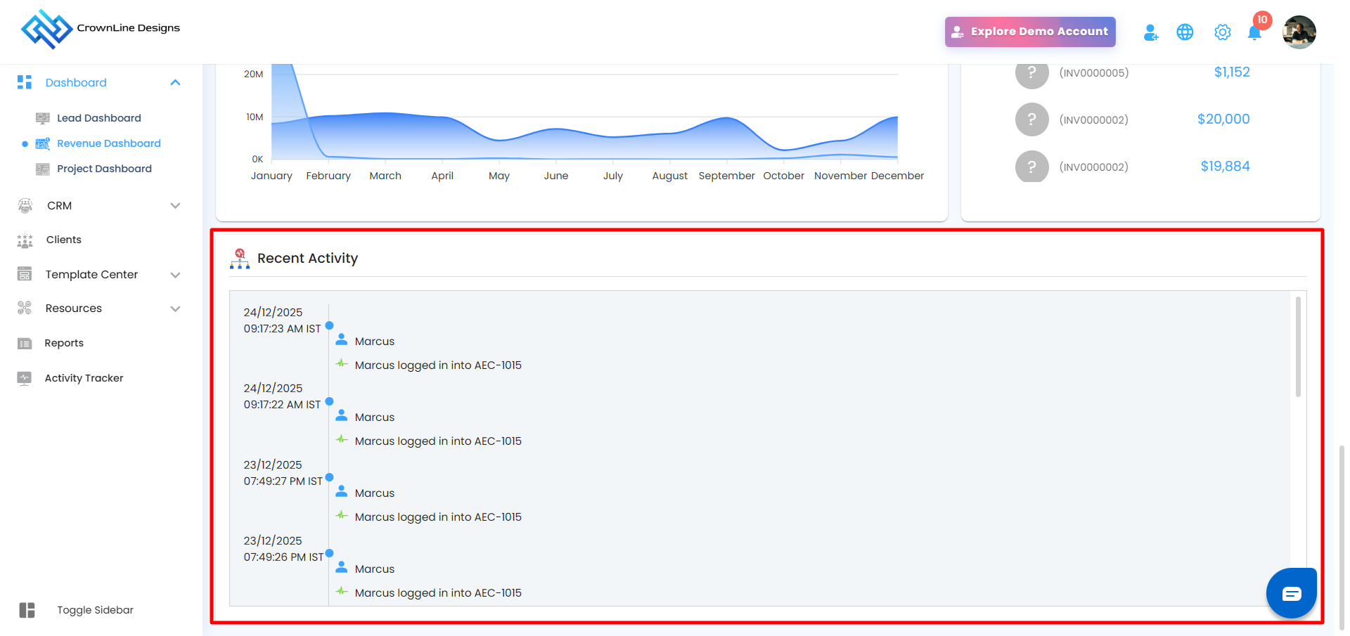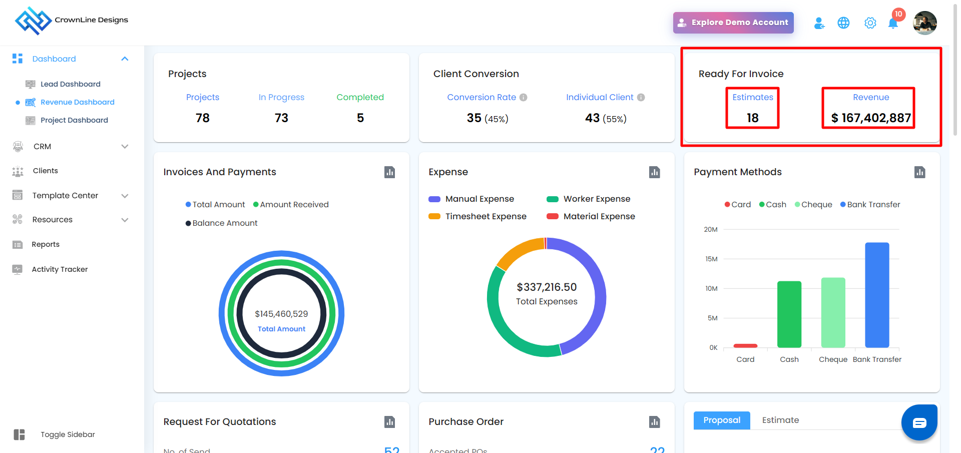 The Revenue Dashboard in the IntoAEC application is your financial control tower. From one place, you can monitor revenue performance, project statuses, client conversions, invoices, expenses, and profits — all tied together with interactive visuals and smart insights.