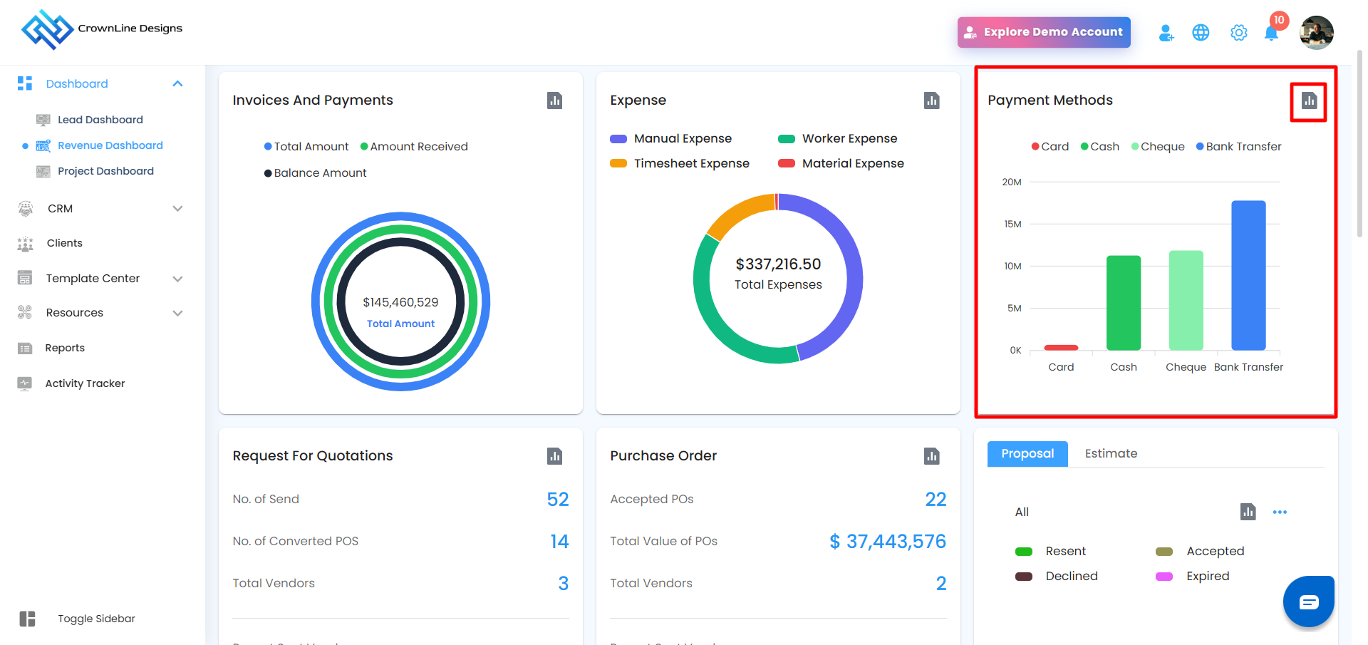 The Payment Methods Bar Graph provides a visual breakdown of how payments were received for issued invoices across all projects. It displays the total amount collected through each of the following payment methods: