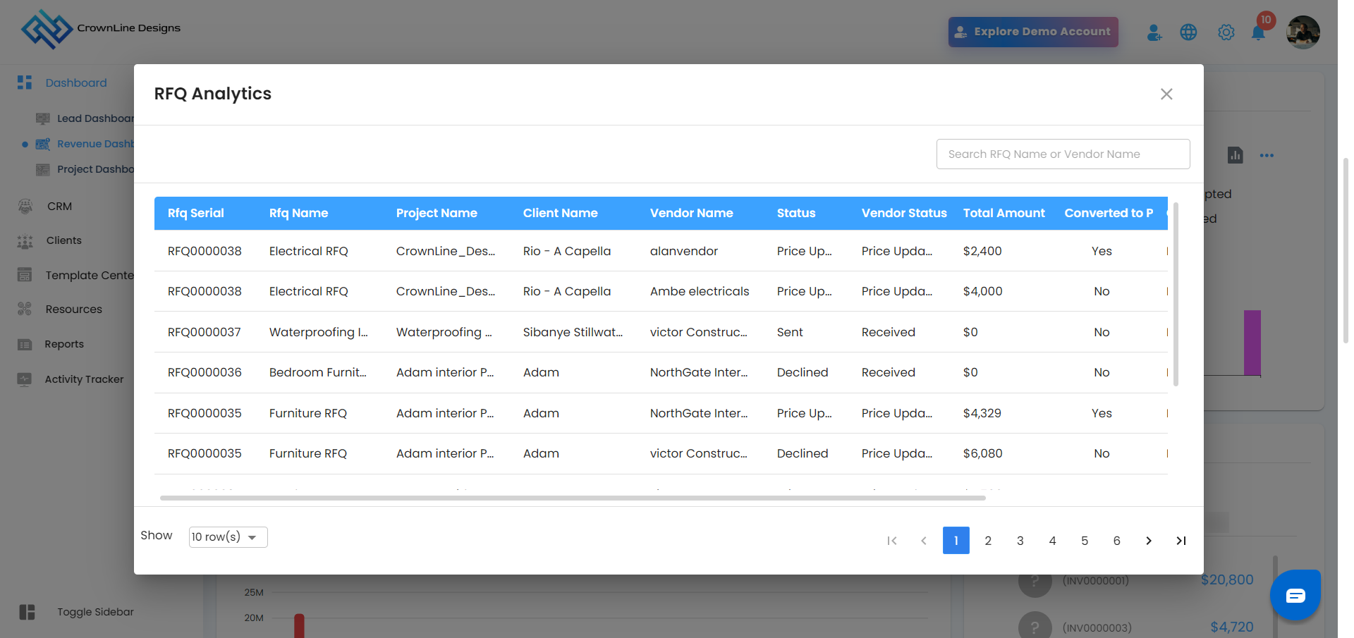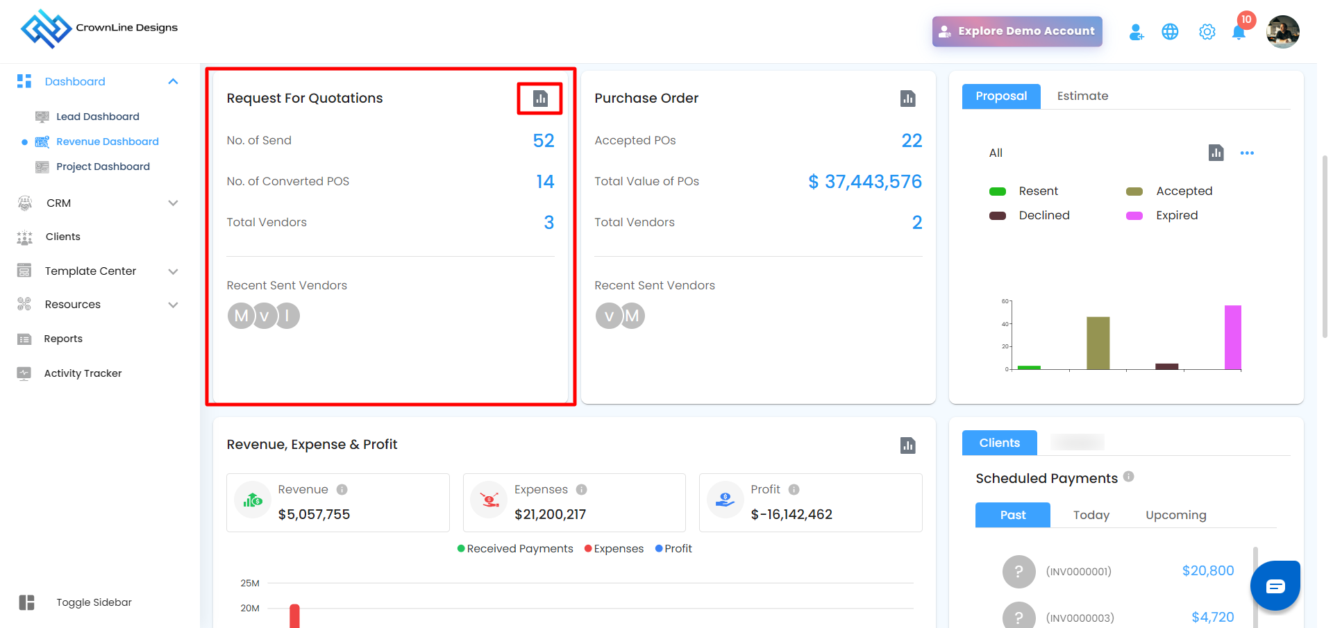 The Request for Quotations (RFQ) card provides visibility into all RFQs raised for vendors and helps track quotation activity across projects.