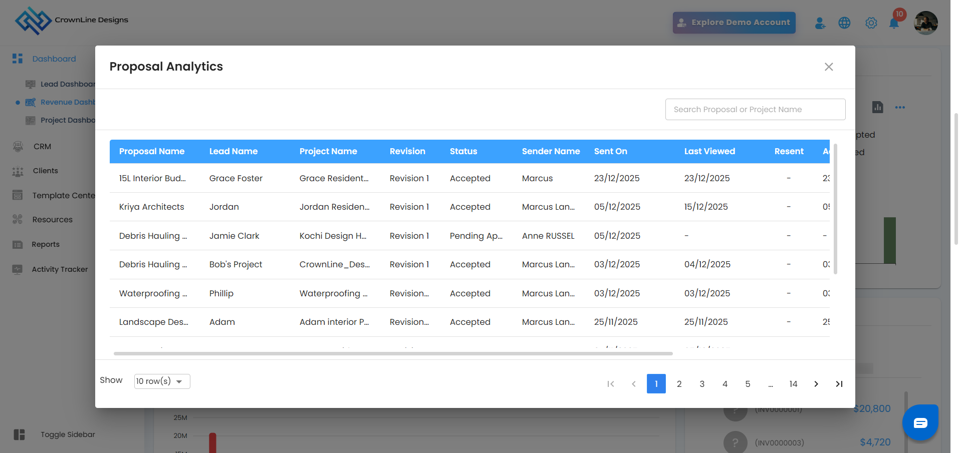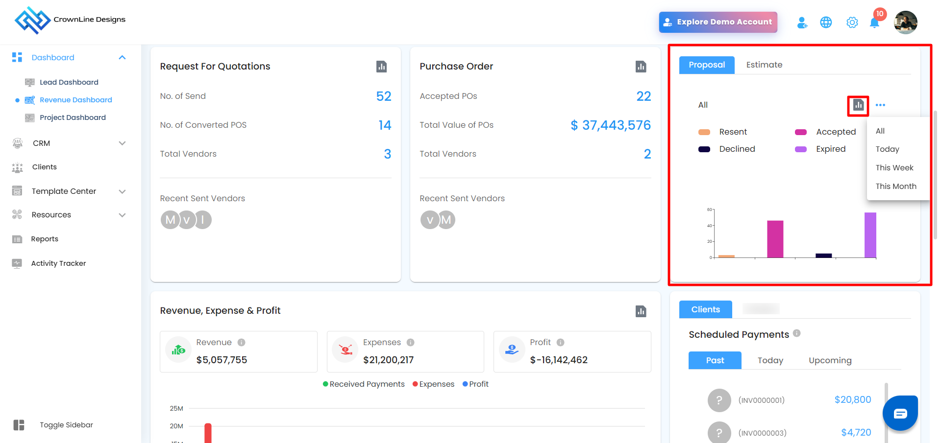 Today – Displays the count of proposals or estimates marked as resent, accepted, declined, or expired specifically on the current day.