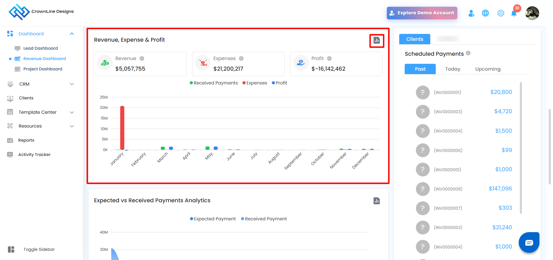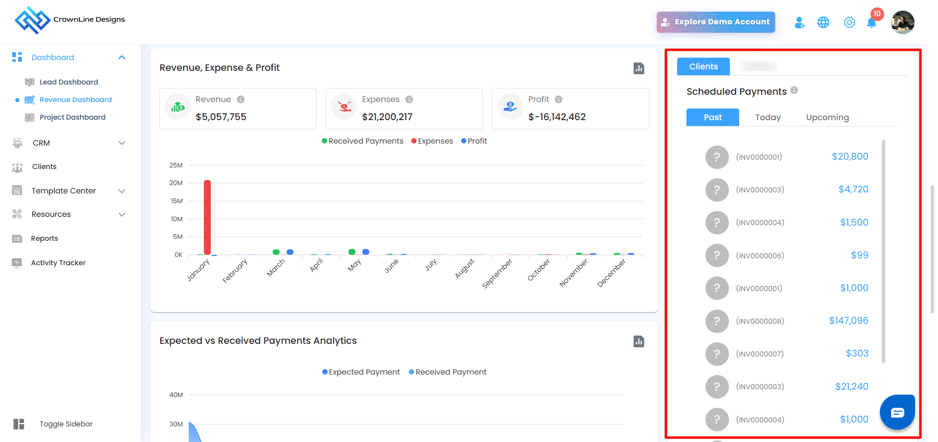 Expected Payments – Represents the total amount of all invoices issued to clients.