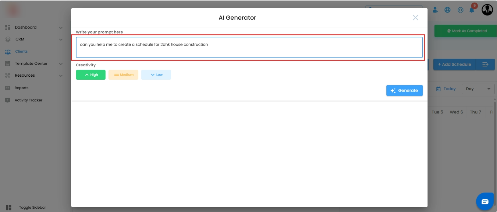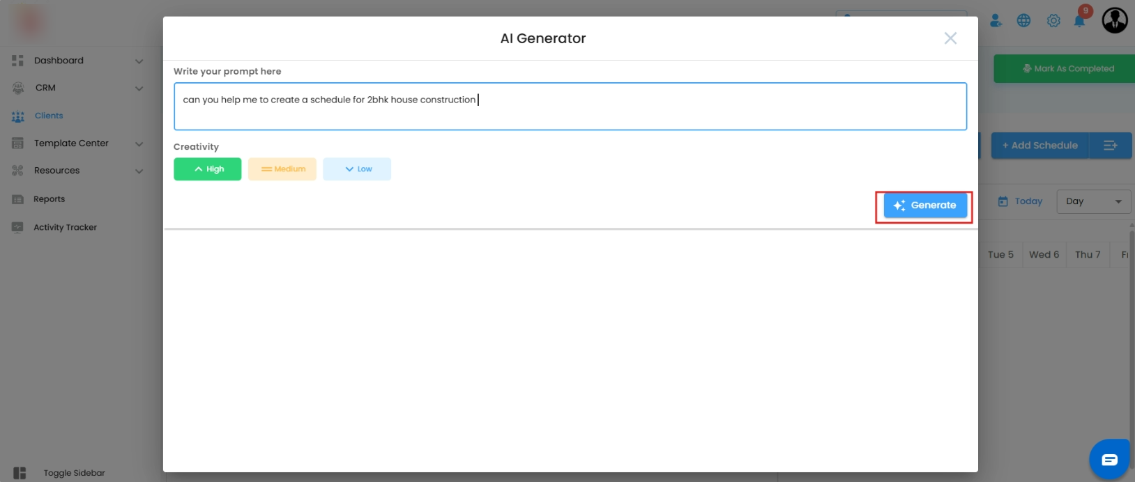 A powerful AI Generator popup appears, ready to assist you in crafting schedules tailored to your needs.