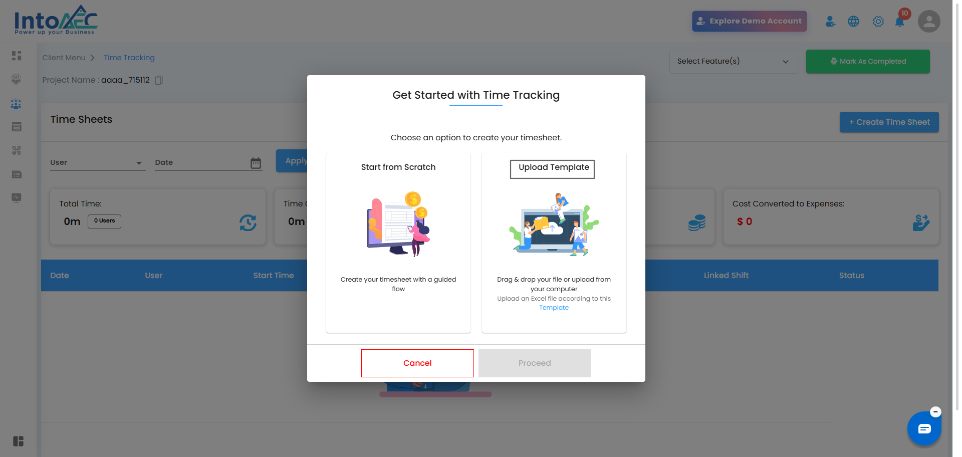 IntoAEC allows you to upload multiple timesheet records in one go through a structured Excel file. This is useful when handling large volumes of time entries.