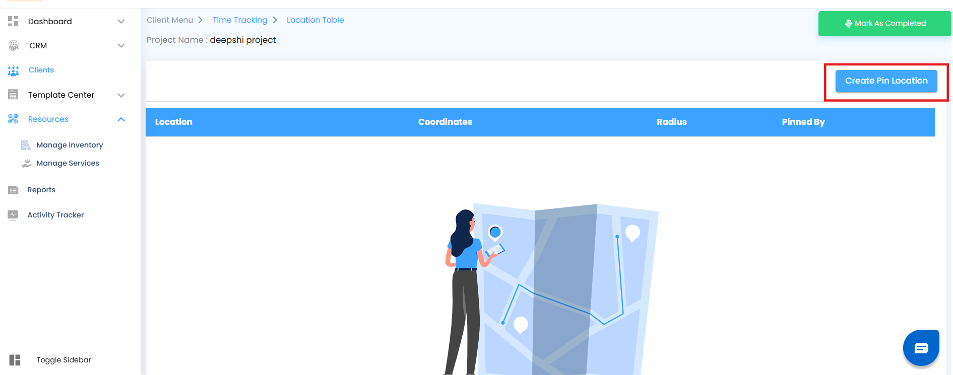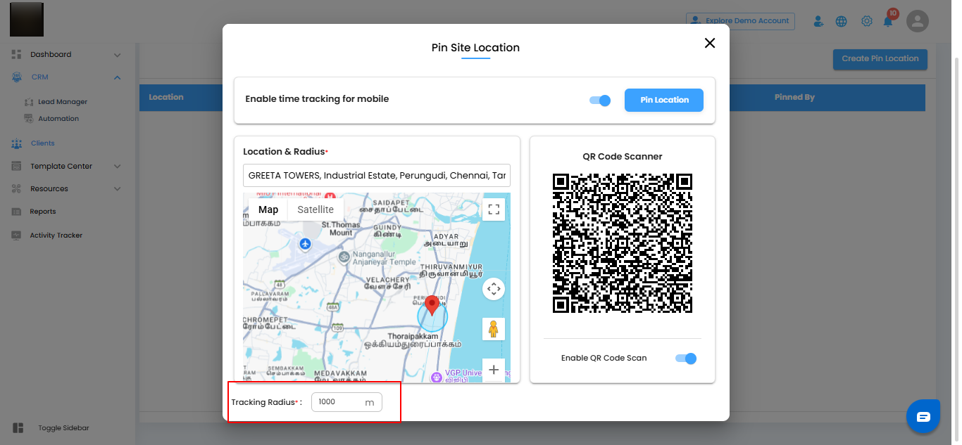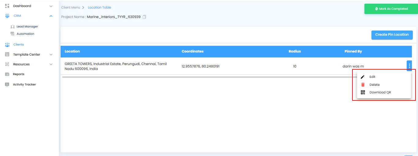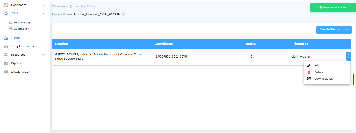 After defining all location details, placing the pin finalizes the project site setup. This ensures accurate tracking and seamless QR check-ins.