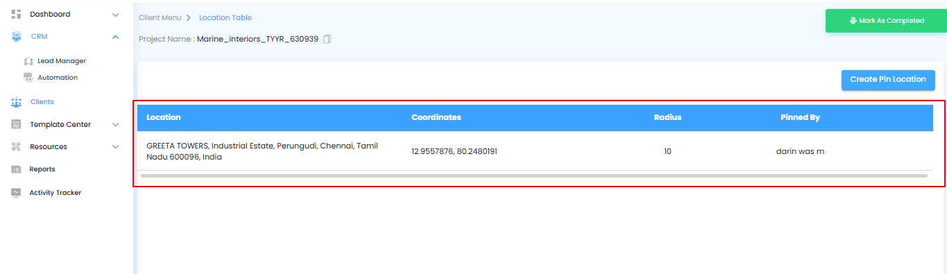 Once a project location is saved, it appears in the Location Table, giving you a clear record of all pinned sites and their key details.