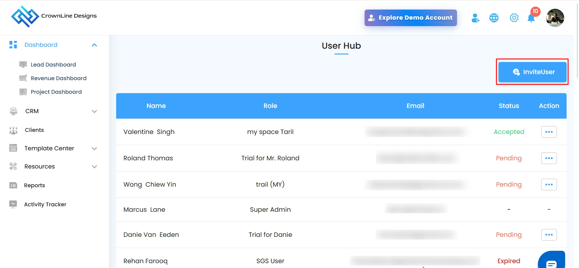 - Open User Hub Page: The User Hub page will open, where you can manage all user-related actions such as invitations, permissions, and status updates.
