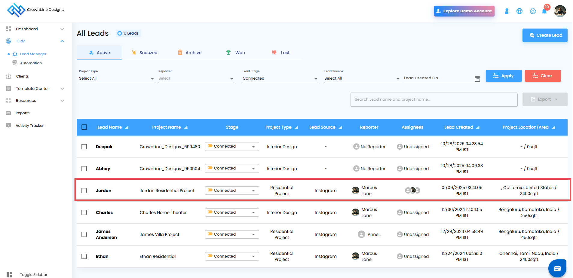 Once saved, the updated assignee will be reflected in the Lead table view, under the corresponding lead entry.
