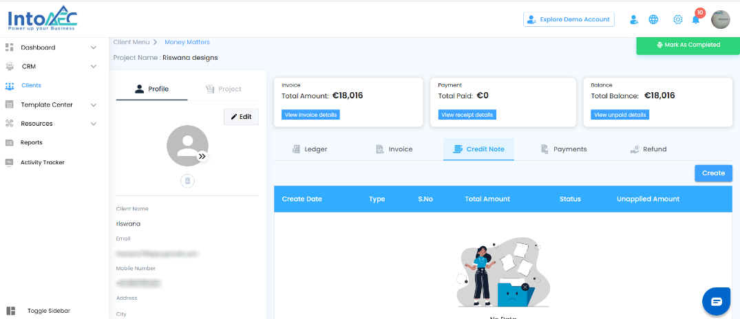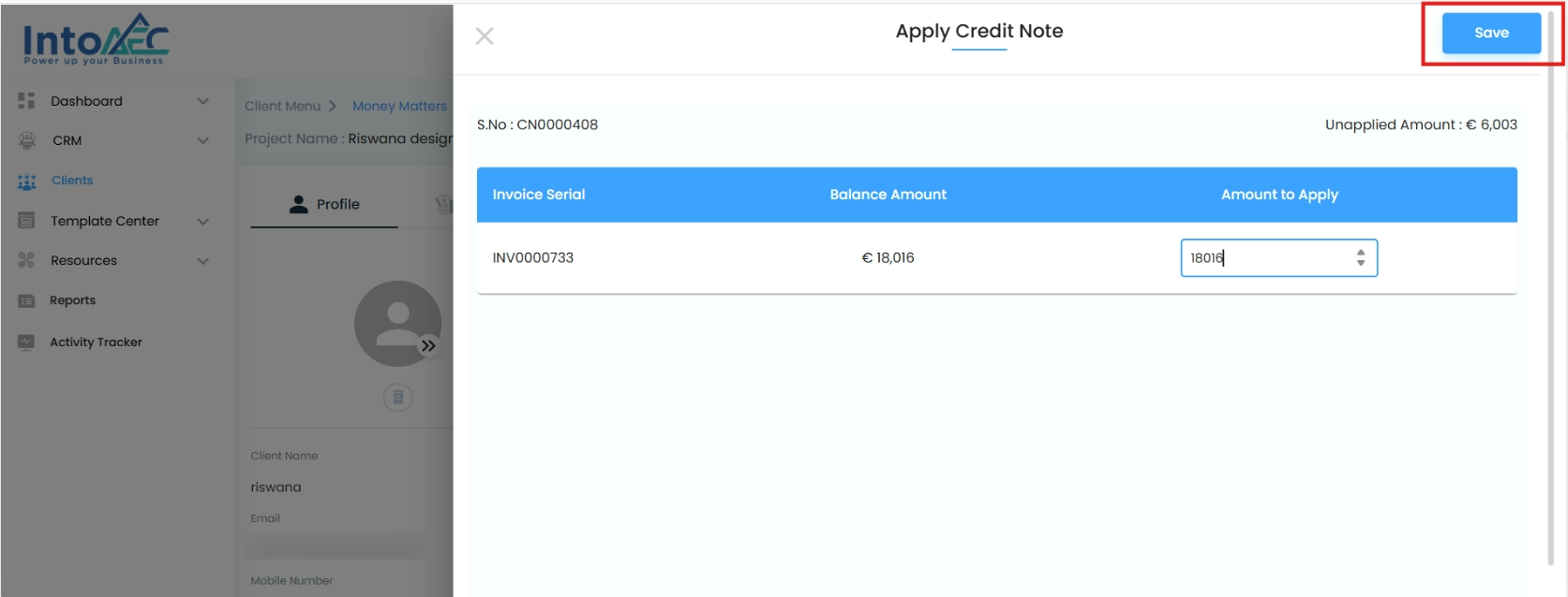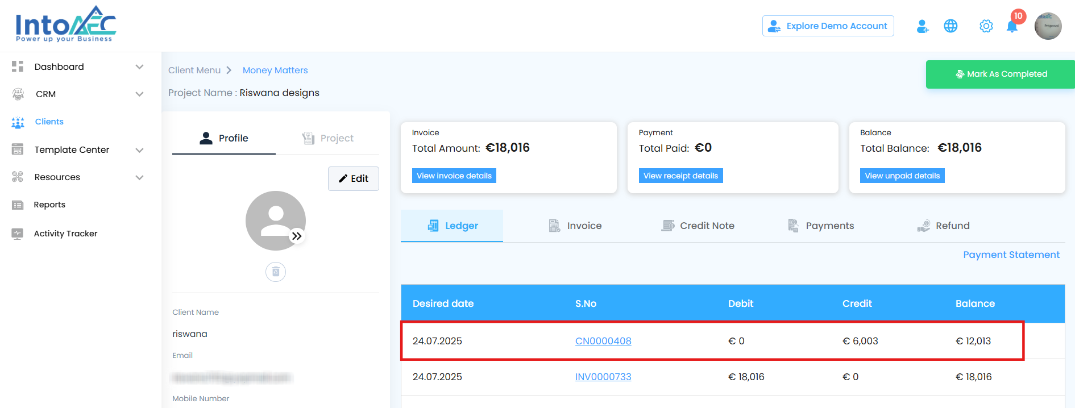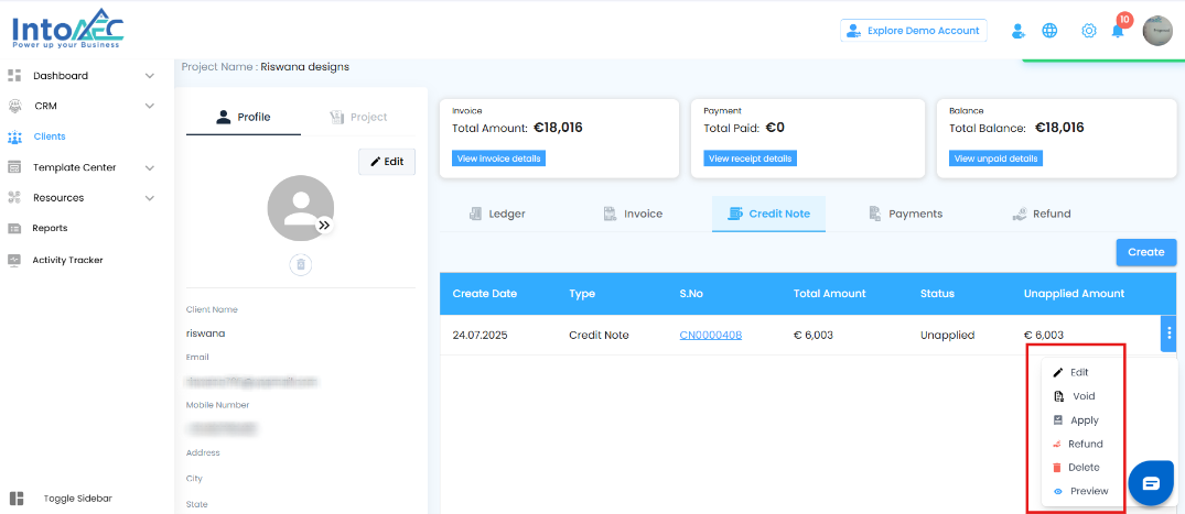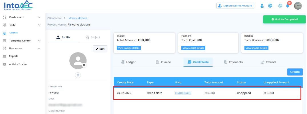 In the Money Matters module, after creating a credit note, you have several management options to keep your records accurate and your invoicing clear. These actions ensure flexibility in correcting, applying, or removing credits when needed.