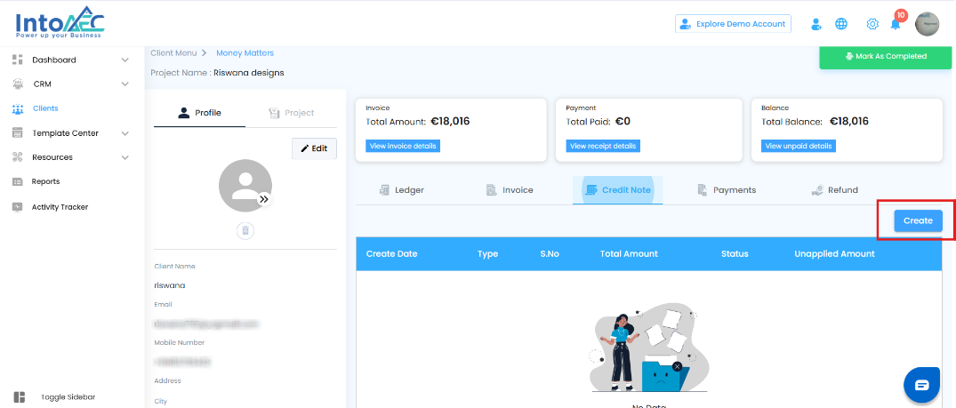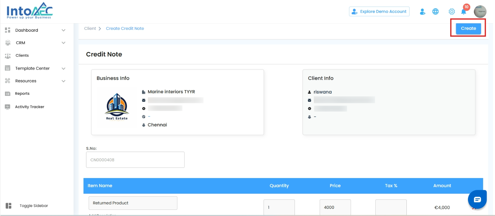 Click the Create button on the Credit Note page