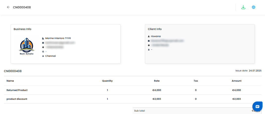Download the credit note as a PDF for record-keeping or client communication