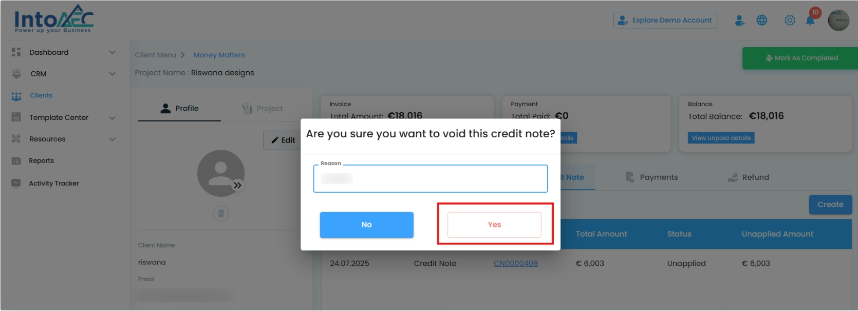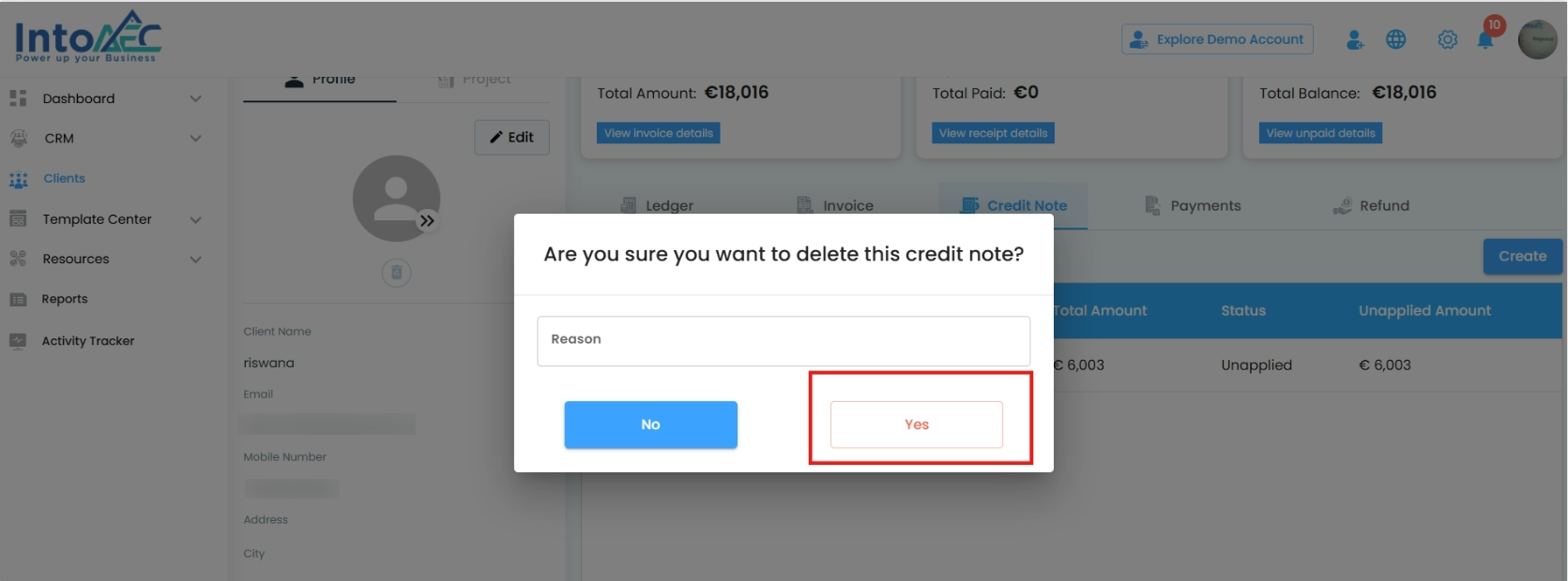 Click yes to permanently delete the credit note.