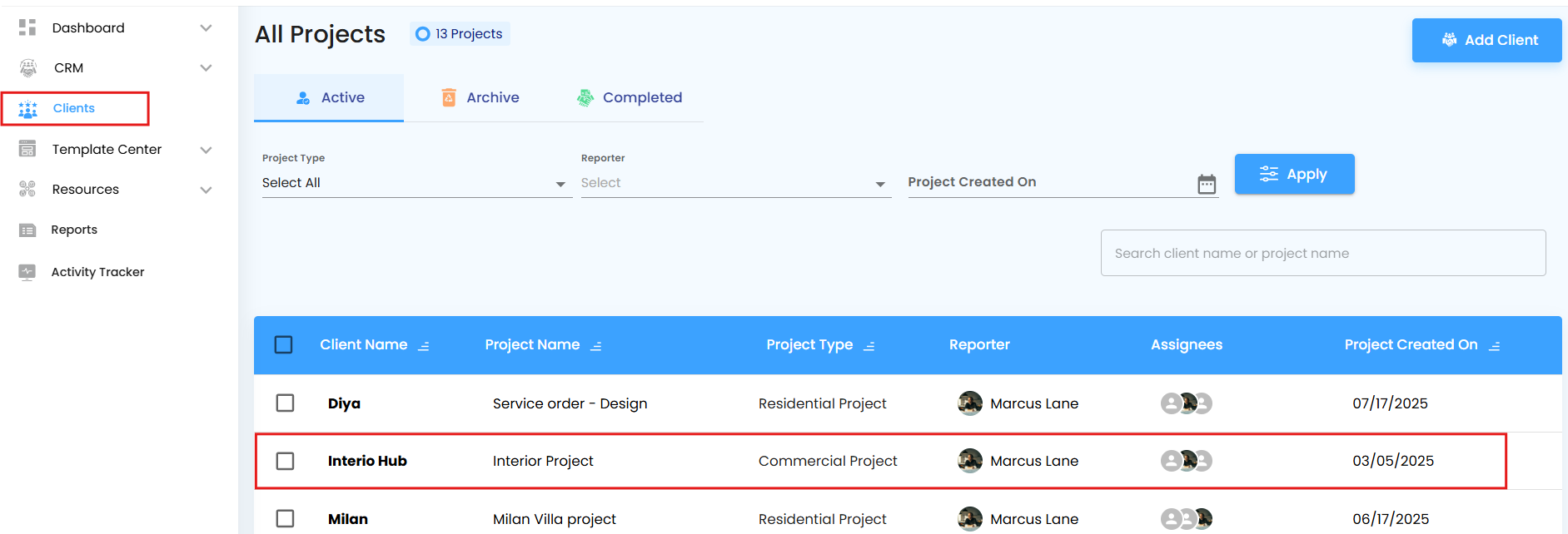 The Project Mastergrid shows all projects—select the one where you want to manage assets.