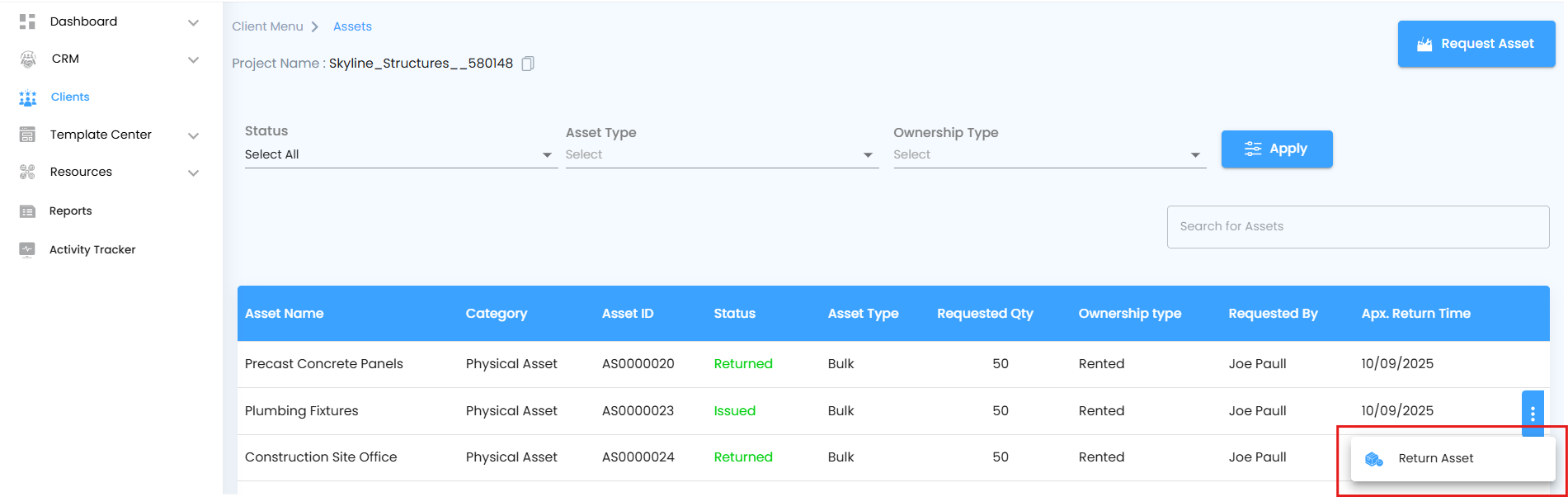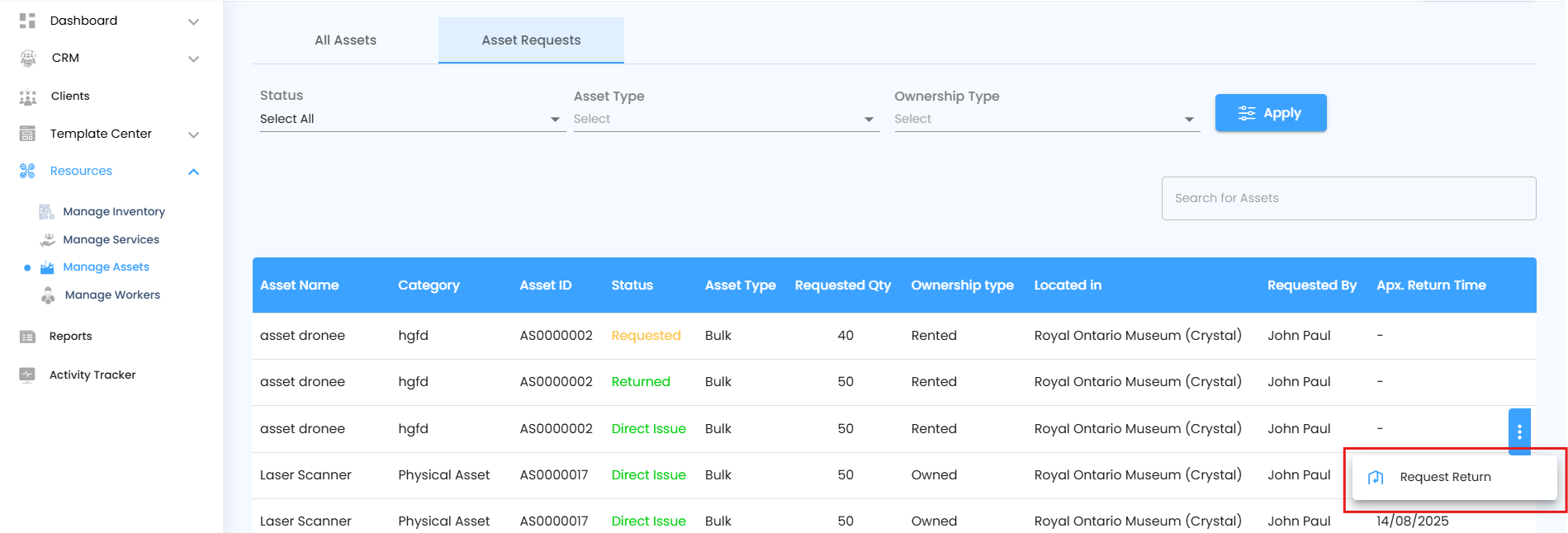 If the Asset Manager needs an asset back, they can trigger the Return Request action (via the ⋮ menu).