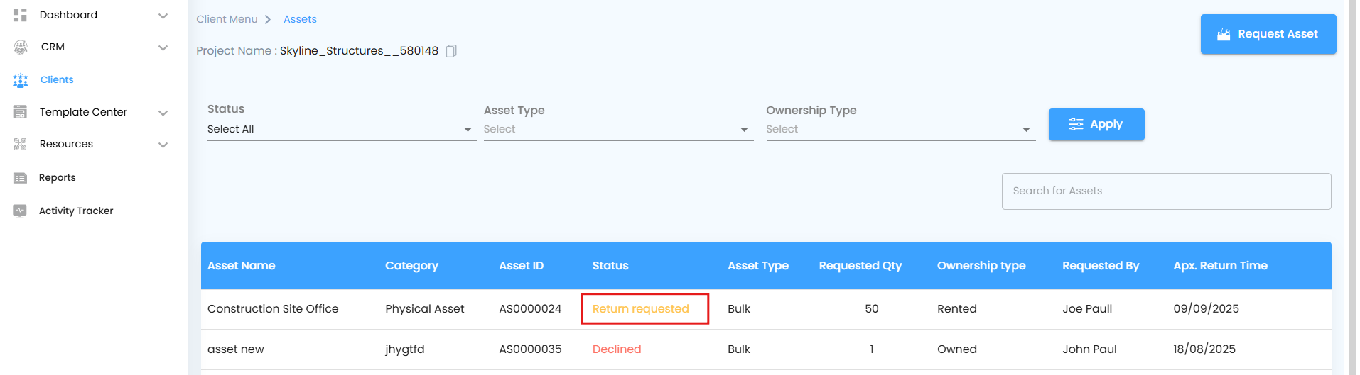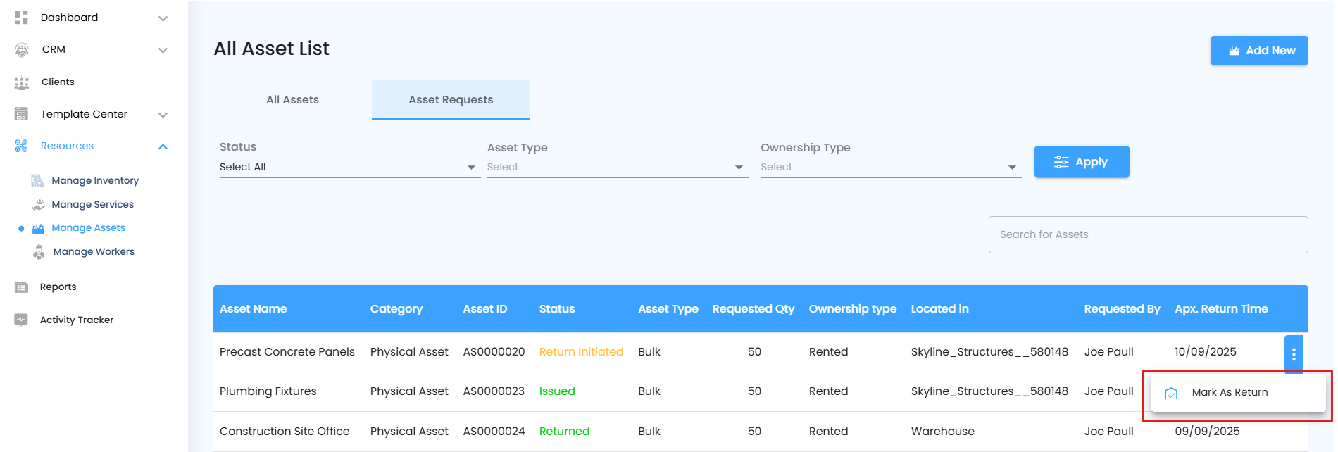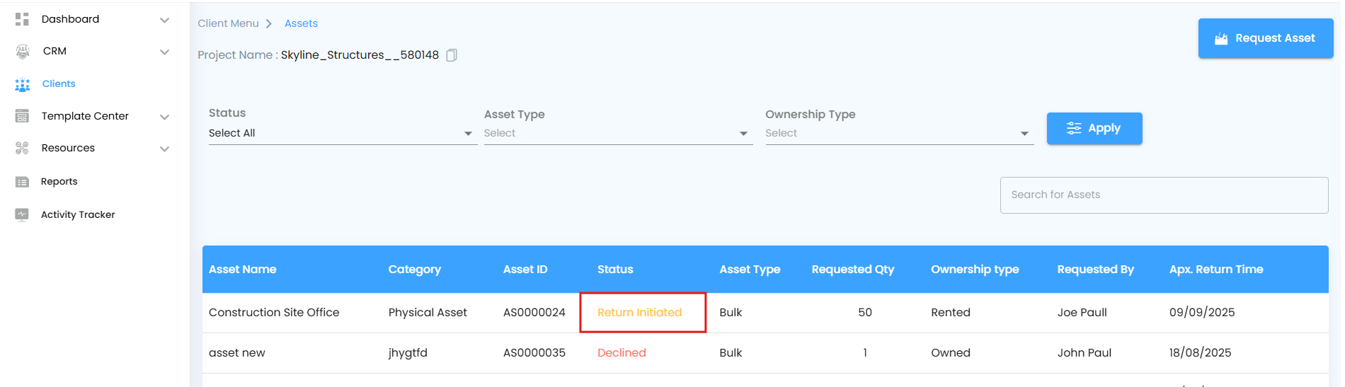 Once the Site Manager clicks Return Asset (⋮ action), the status updates to Return Initiated.