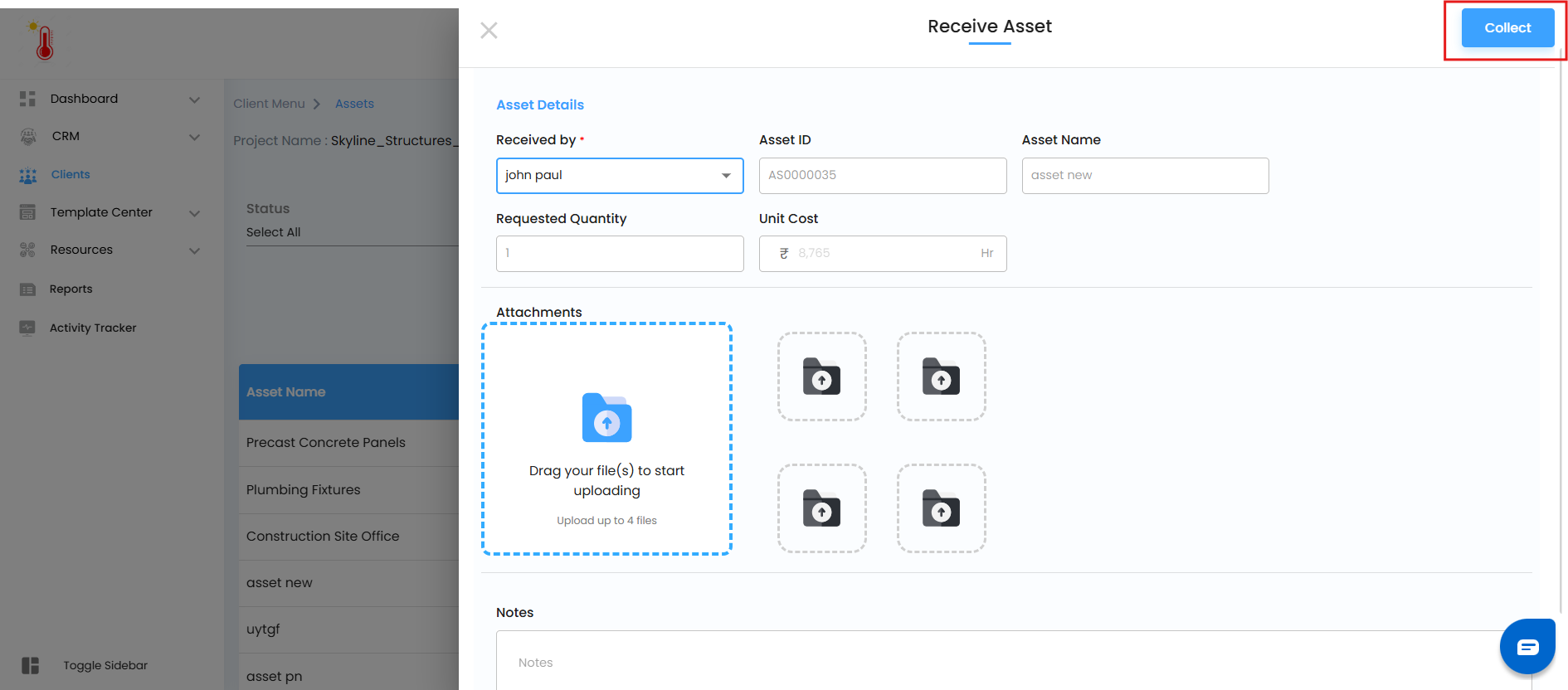 - As soon as Mark as Received is clicked, a Receive Asset off-canvas panel slides in — think of it like your project’s digital delivery slip.