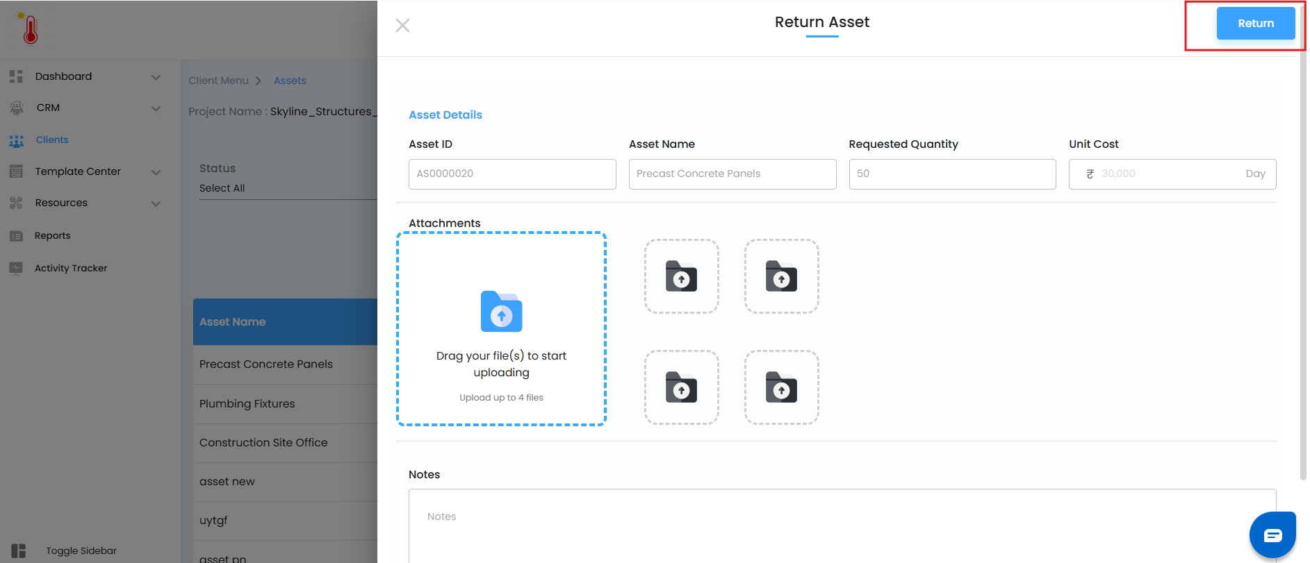 - Clicking it opens the Return Asset off-canvas panel, like a digital return desk ready to process the item.
