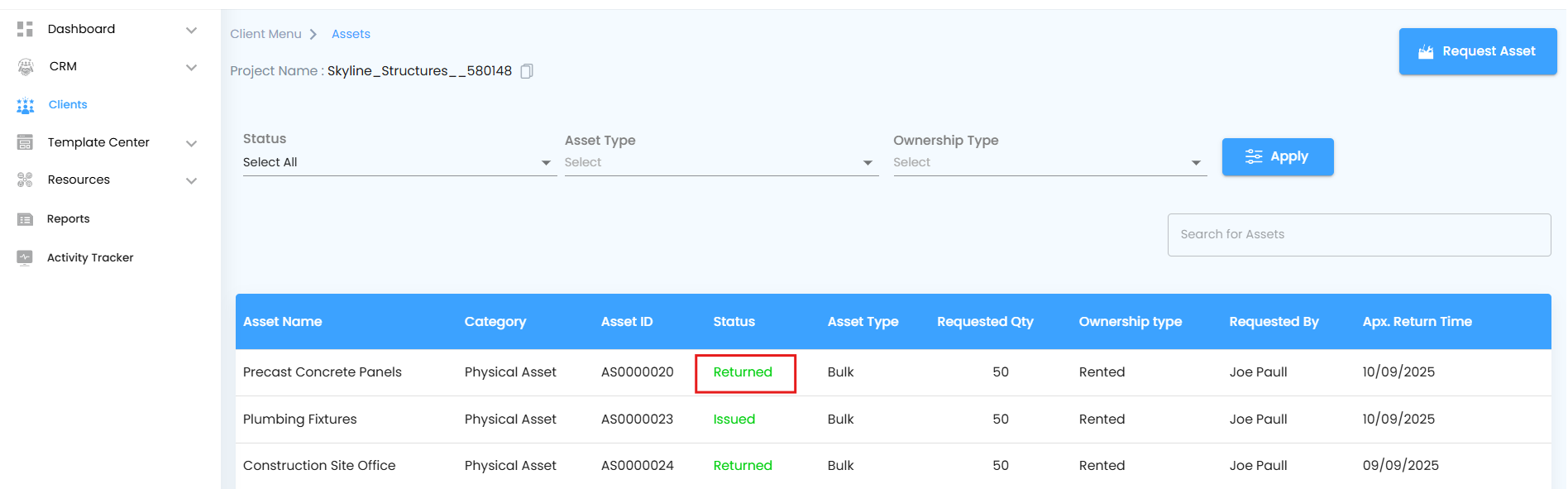 - Finally, hitting the Return button completes the action and updates the status to Return Initiated, signaling the asset is officially on its way back.