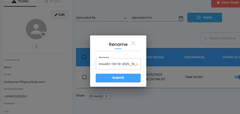 The document section makes it easy to find and manage files, even when your project library grows large. With filters and clear document details, you can quickly locate what you need and control how it’s shared.