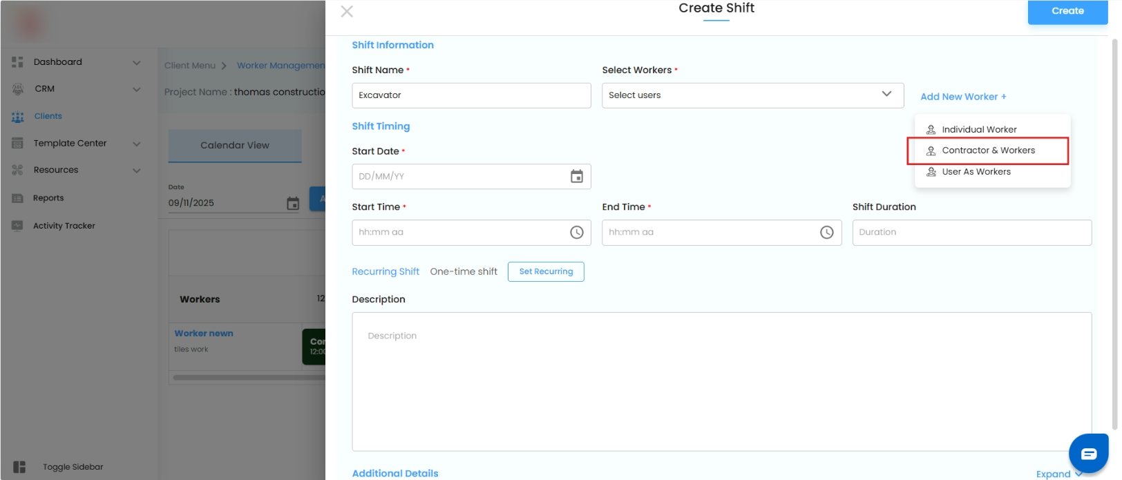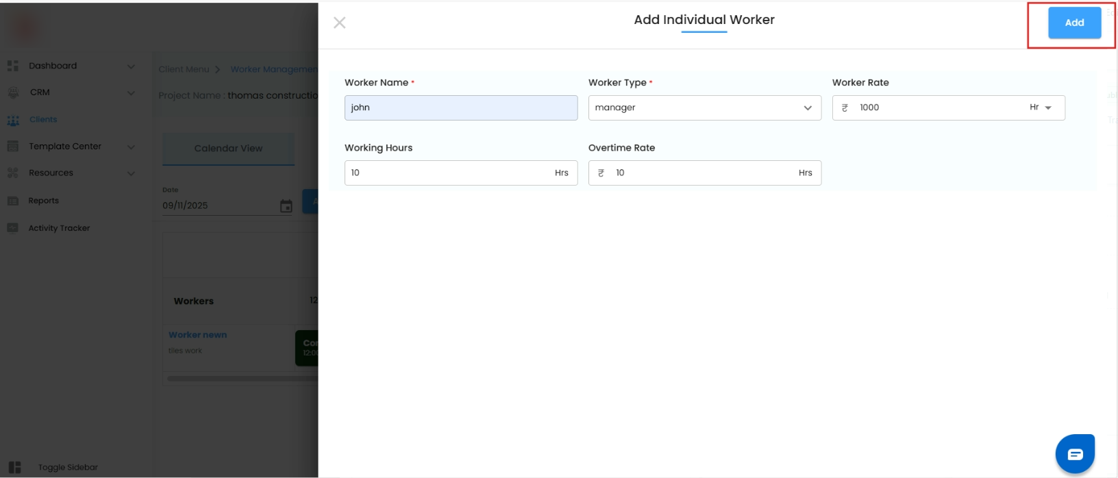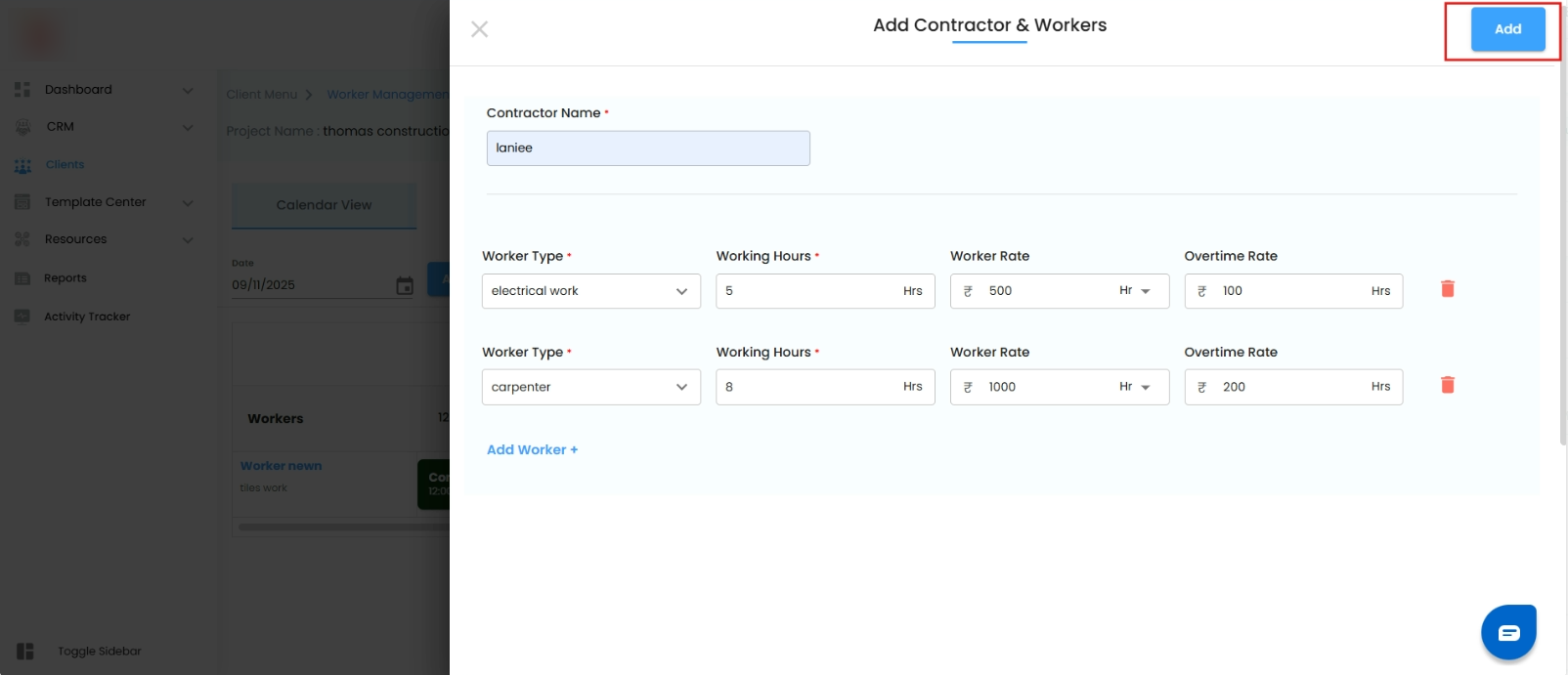 Add Worker Section → Here you can add multiple workers under the contractor by filling in: