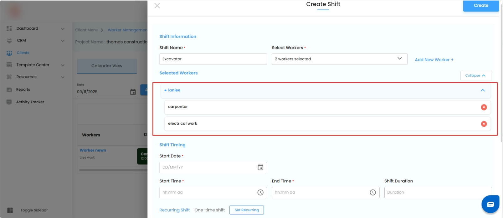 Workers are the core of your shift. The Select Workers dropdown (with built-in search) lets you: