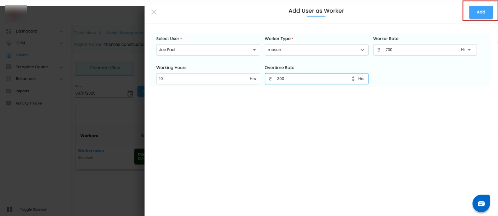 Worker Type* → Choose from predefined worker types (e.g., Mason, Carpenter, Helper, Driver).