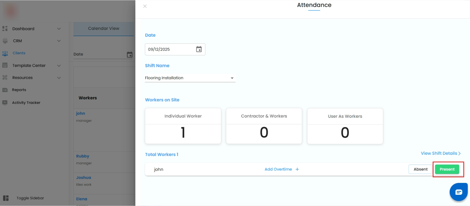 When a worker is marked Present, you’ll see an Add Overtime button appear: