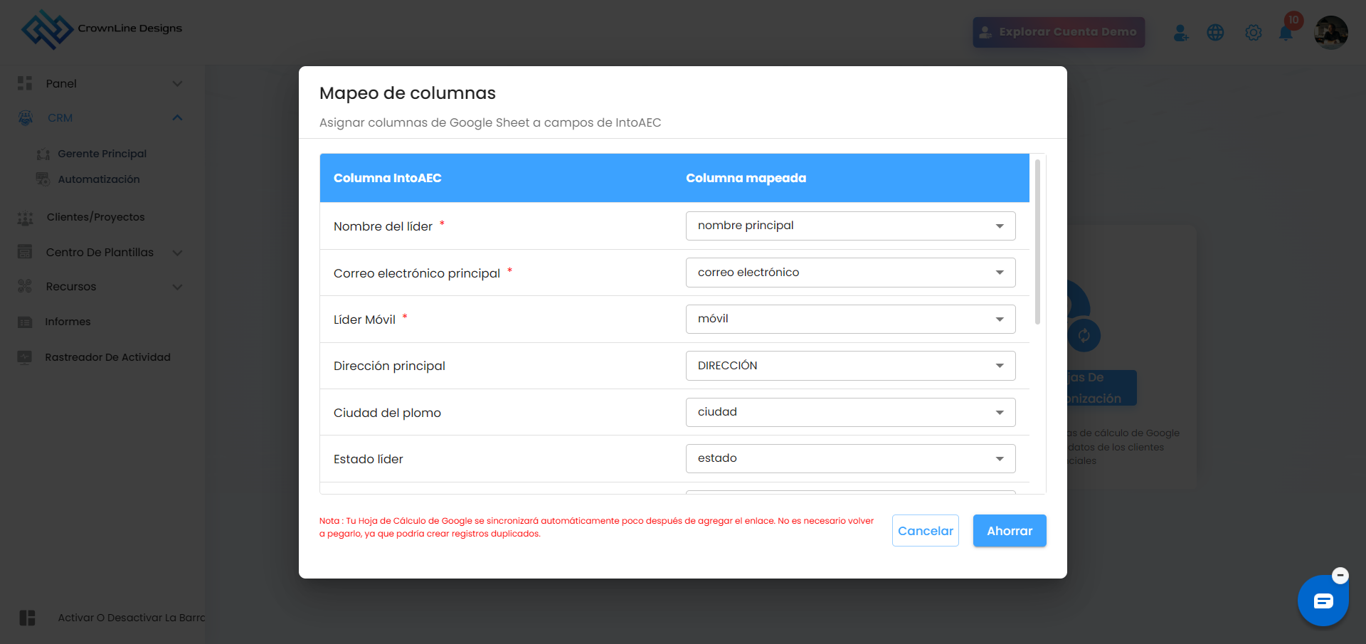 Use clear and consistent column names in your Google Sheet (such as leadName or projectBudget) to help IntoAEC auto-match fields quickly and minimize mapping errors.