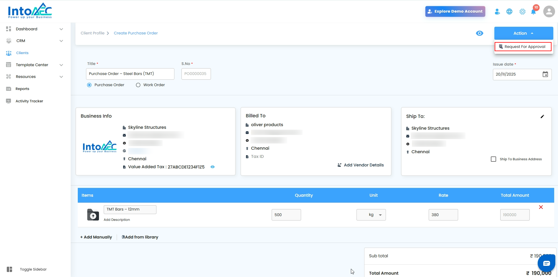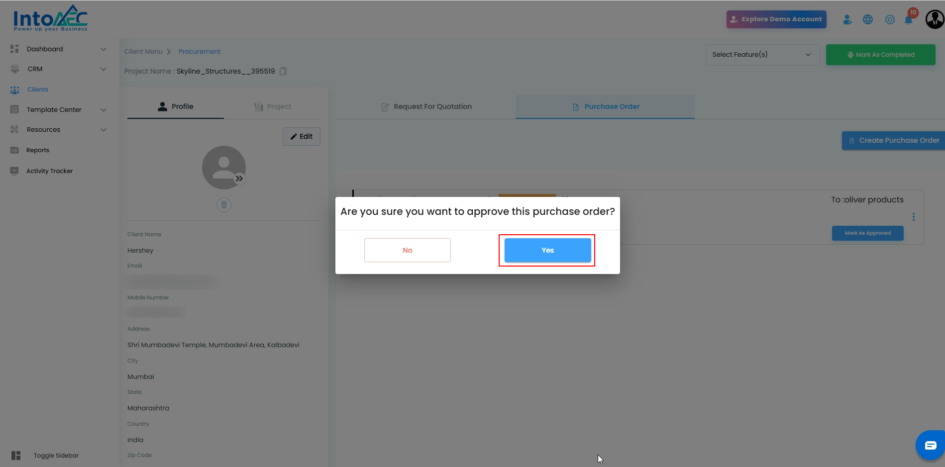 Select the specific client for whom you want to create the PO.