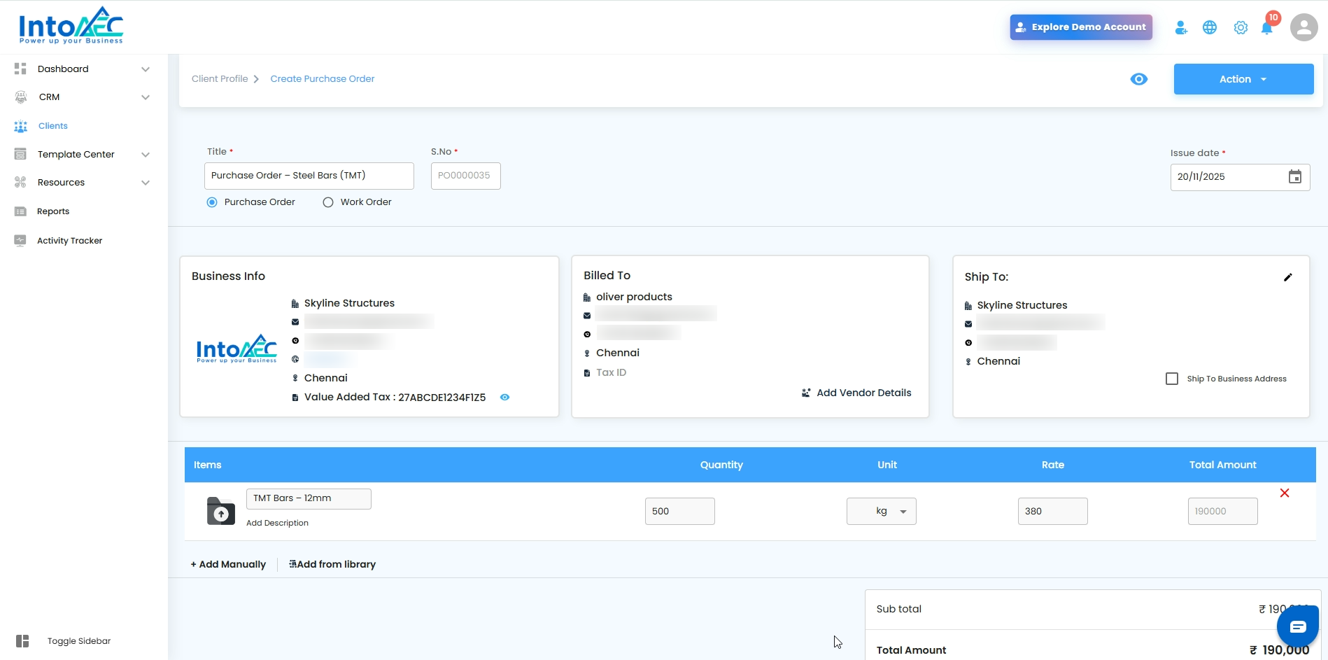 Fill in all the required information, including selecting the vendor to whom the PO will be sent.