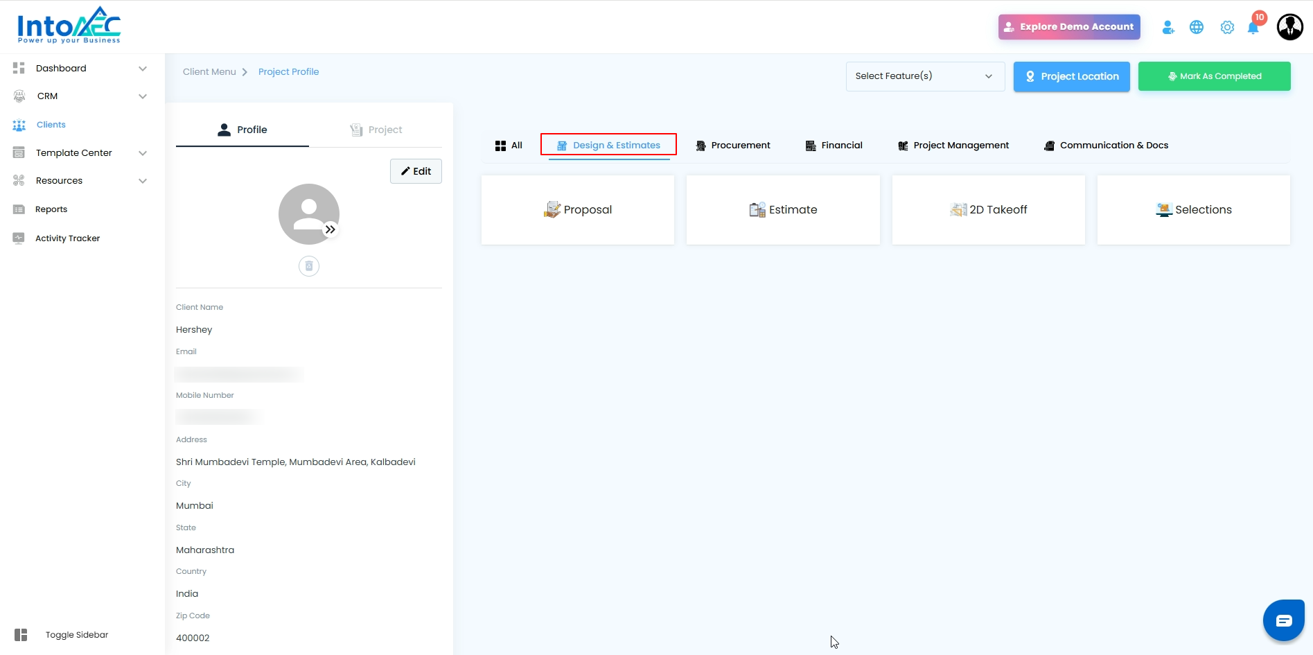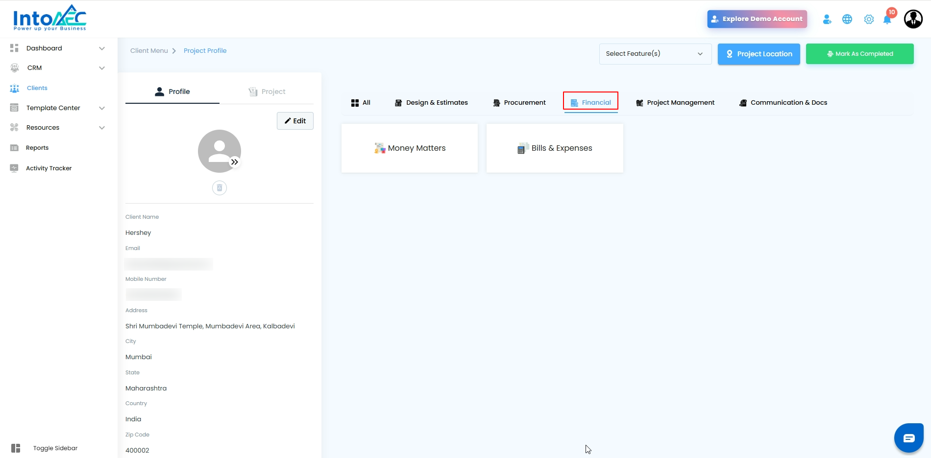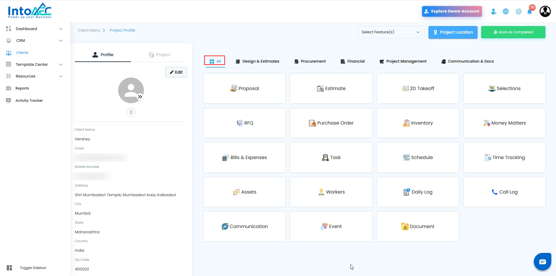 The Client page includes category-based navigation tabs that help you quickly access all project-related modules in an organized way. These tabs group similar tools together, making it easier to find and manage project information.