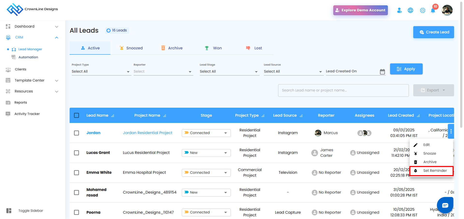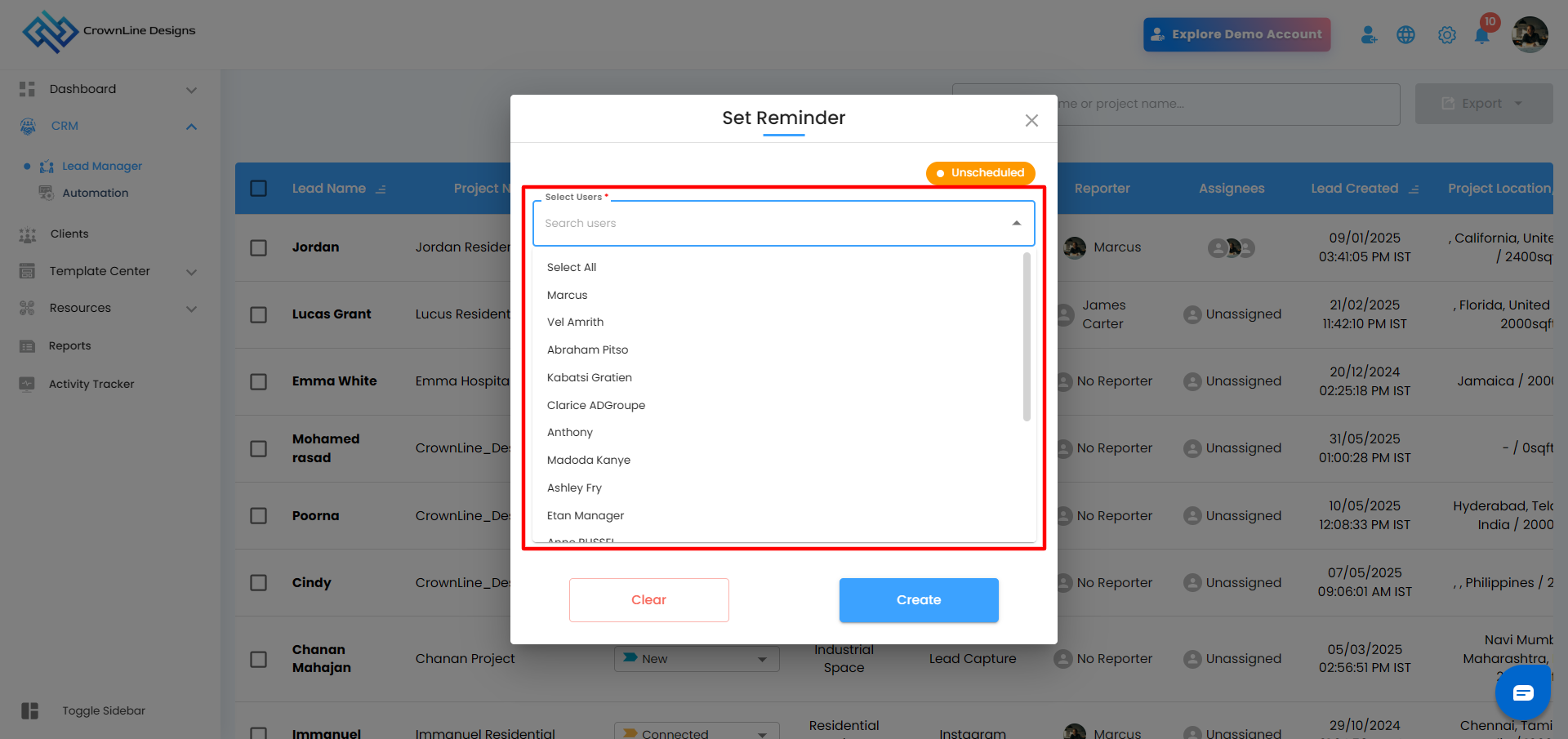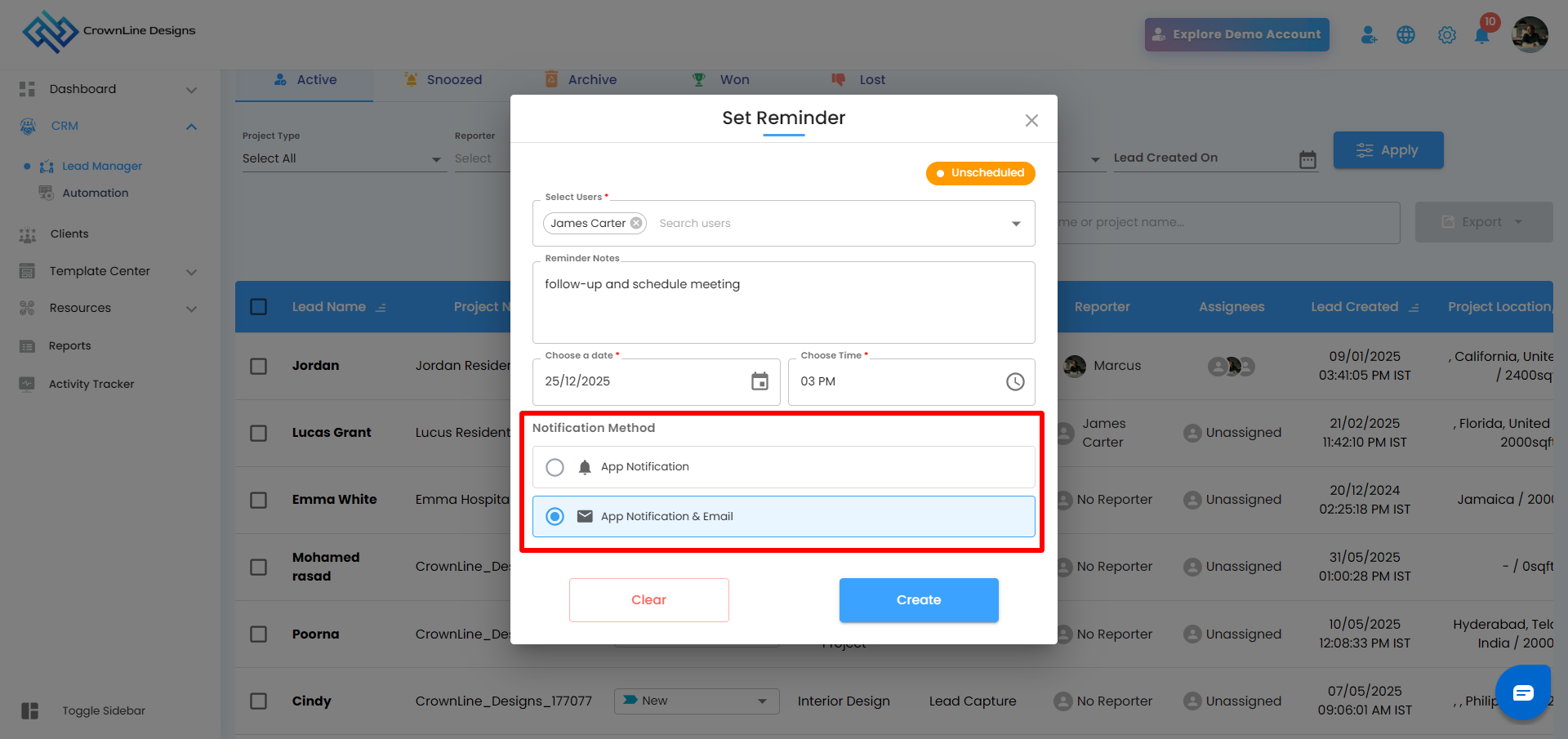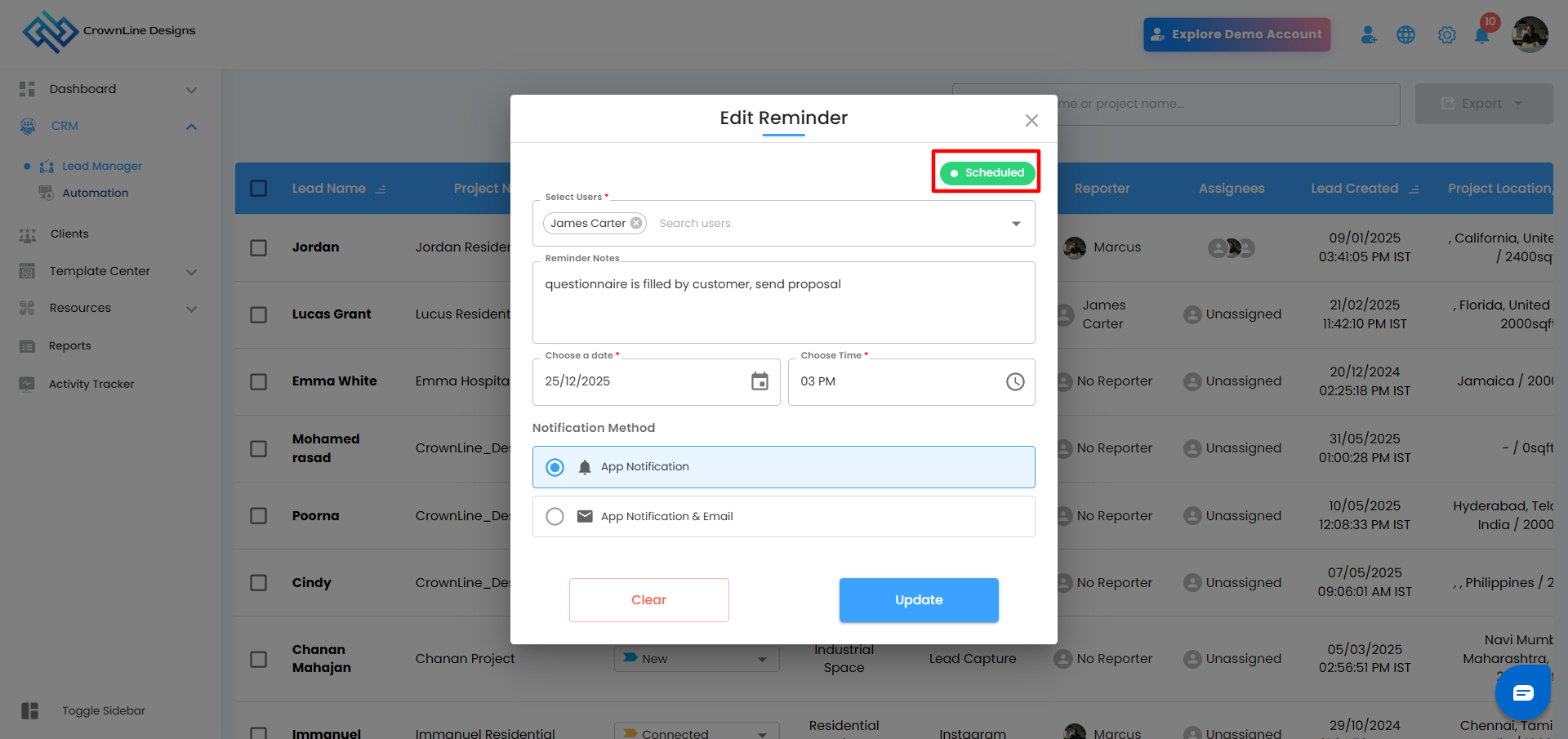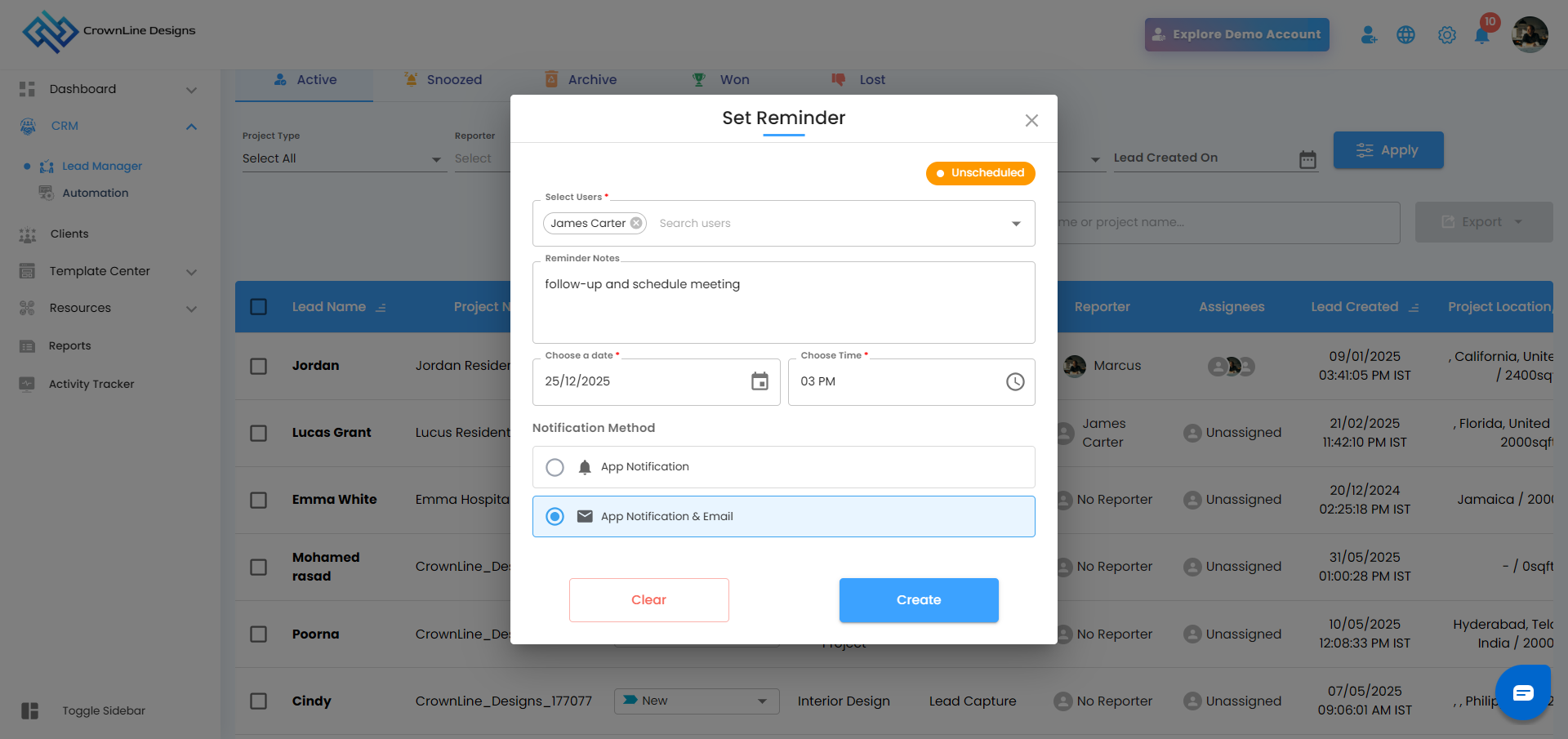 The Lead Set Reminder feature in intoAEC helps you schedule follow-ups for leads so you never miss an important call, meeting, or action. Reminders are optional, easy to manage, and fully flexible.