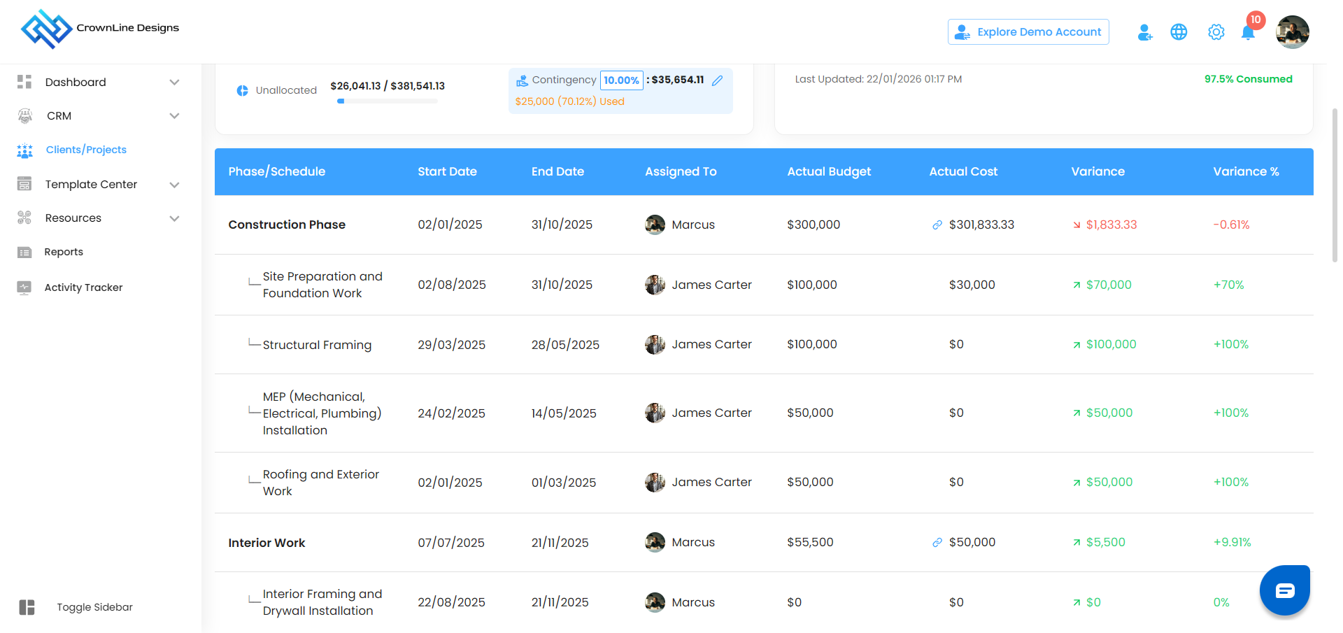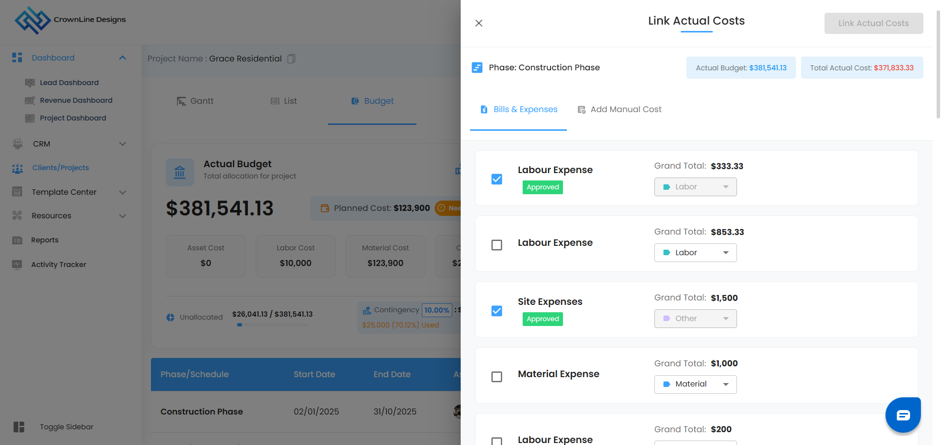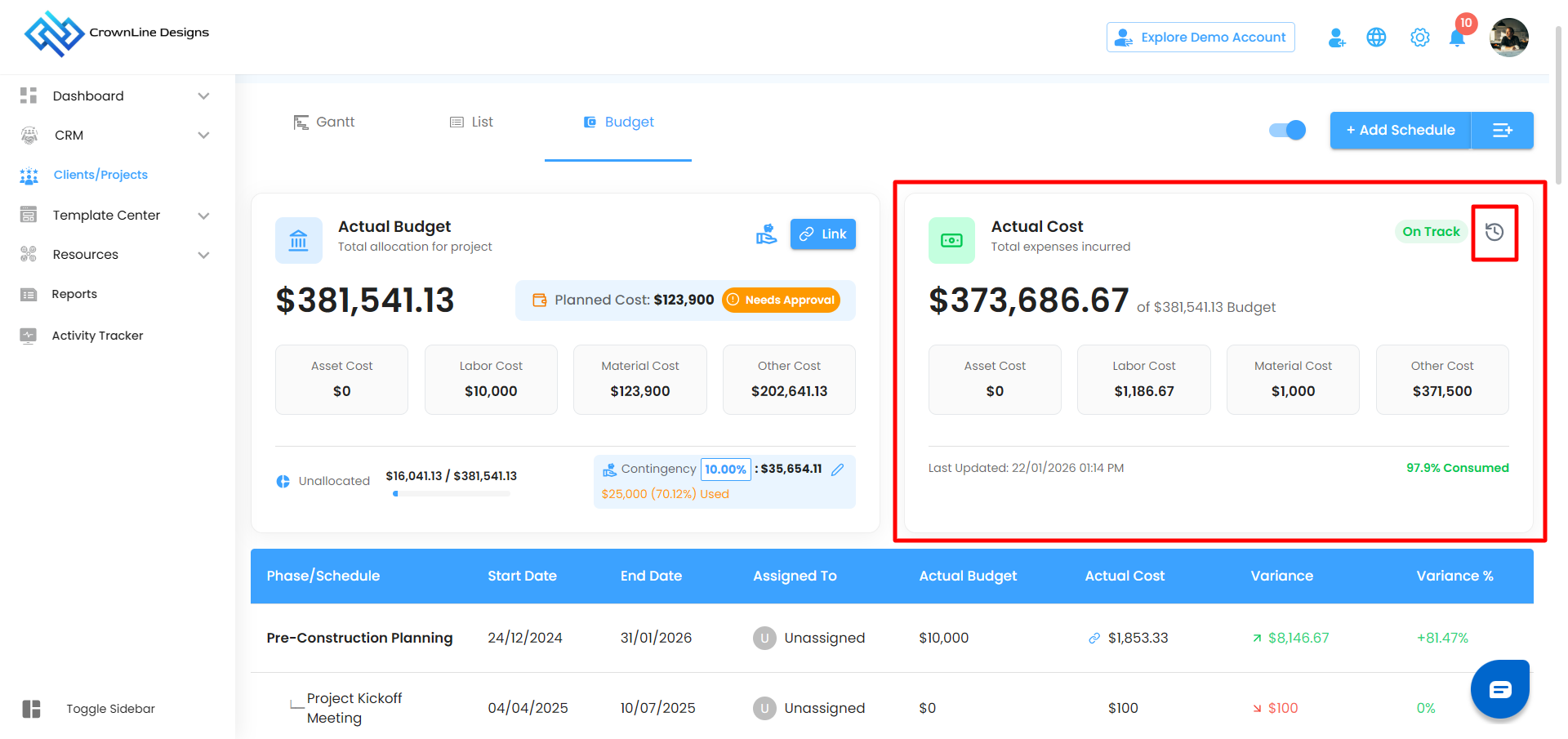 The Actual Cost card shows the total expenses incurred for the project.