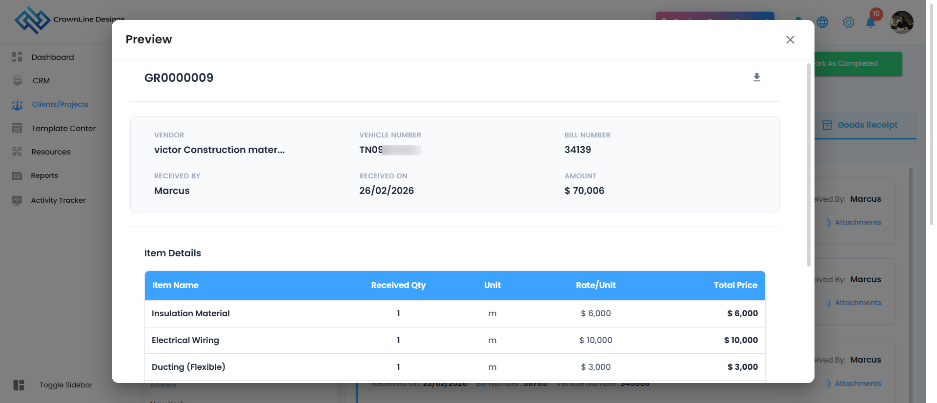 When materials are requested from existing stock,the request is converted into a Goods Received Note to track internal movement to the project site.