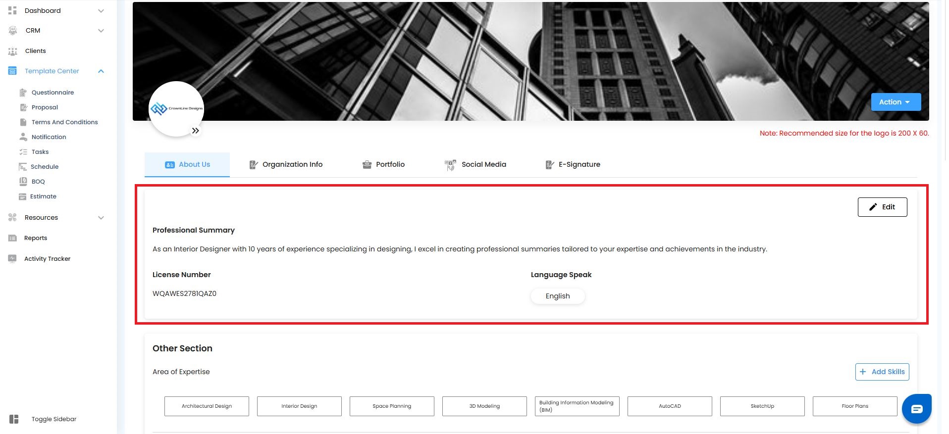 - Area of Expertise & Skills - Add your organization’s key skills by clicking on "Add Skills".