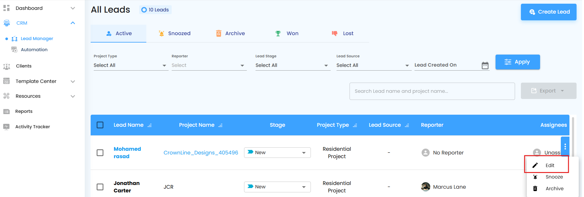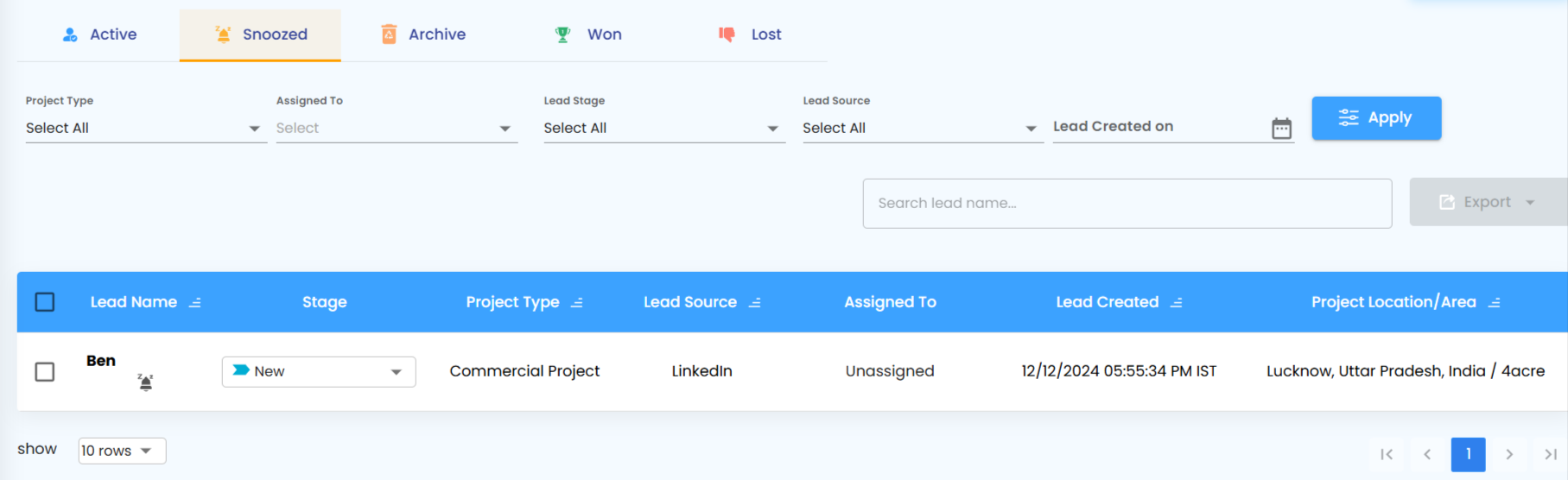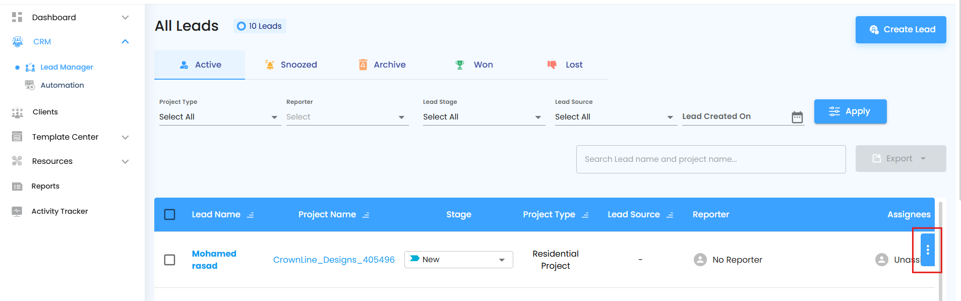 By default, only Active Leads are displayed. Each lead is presented in a clean, structured layout, giving you instant insight into its status. You can also search or filter to locate specific leads quickly.