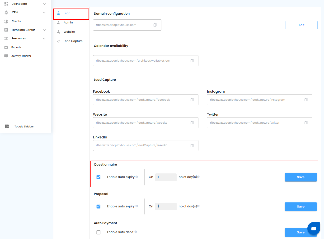 - Go to Lead, then choose Questionnaire to adjust the default expiration settings.