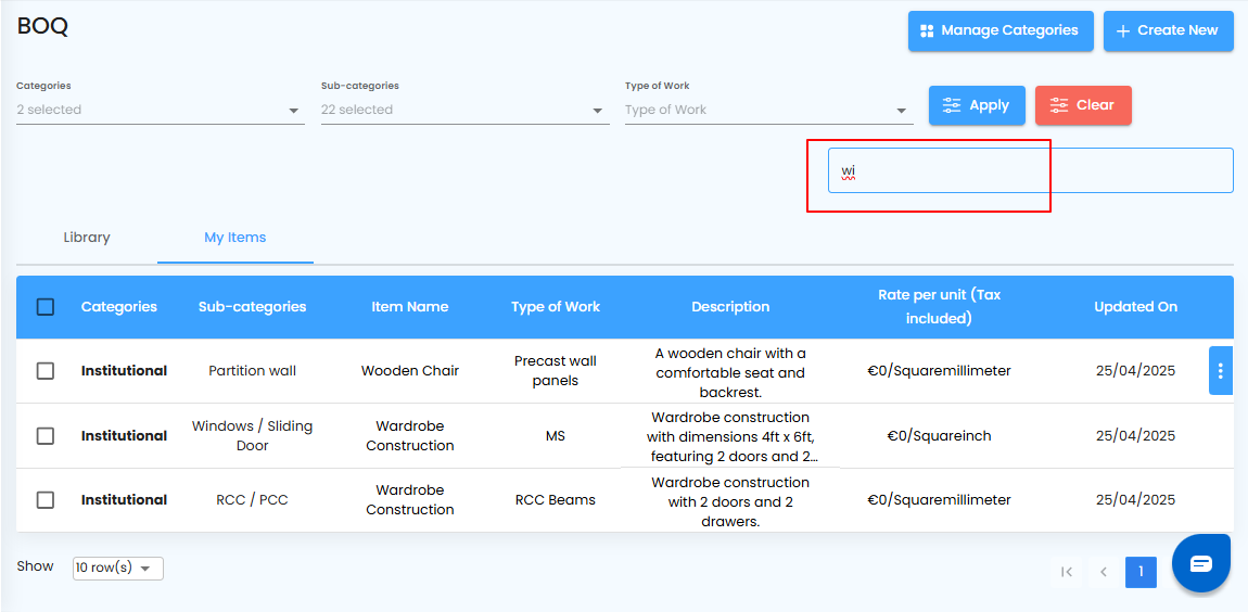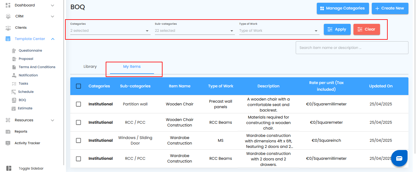 - Click the Apply button to display the filtered items.