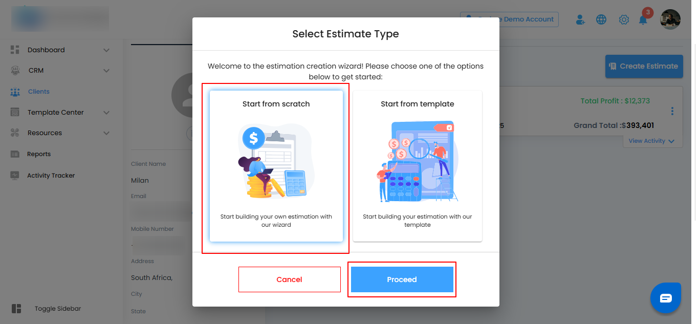 - Choose the estimate type you prefer and click Proceed.